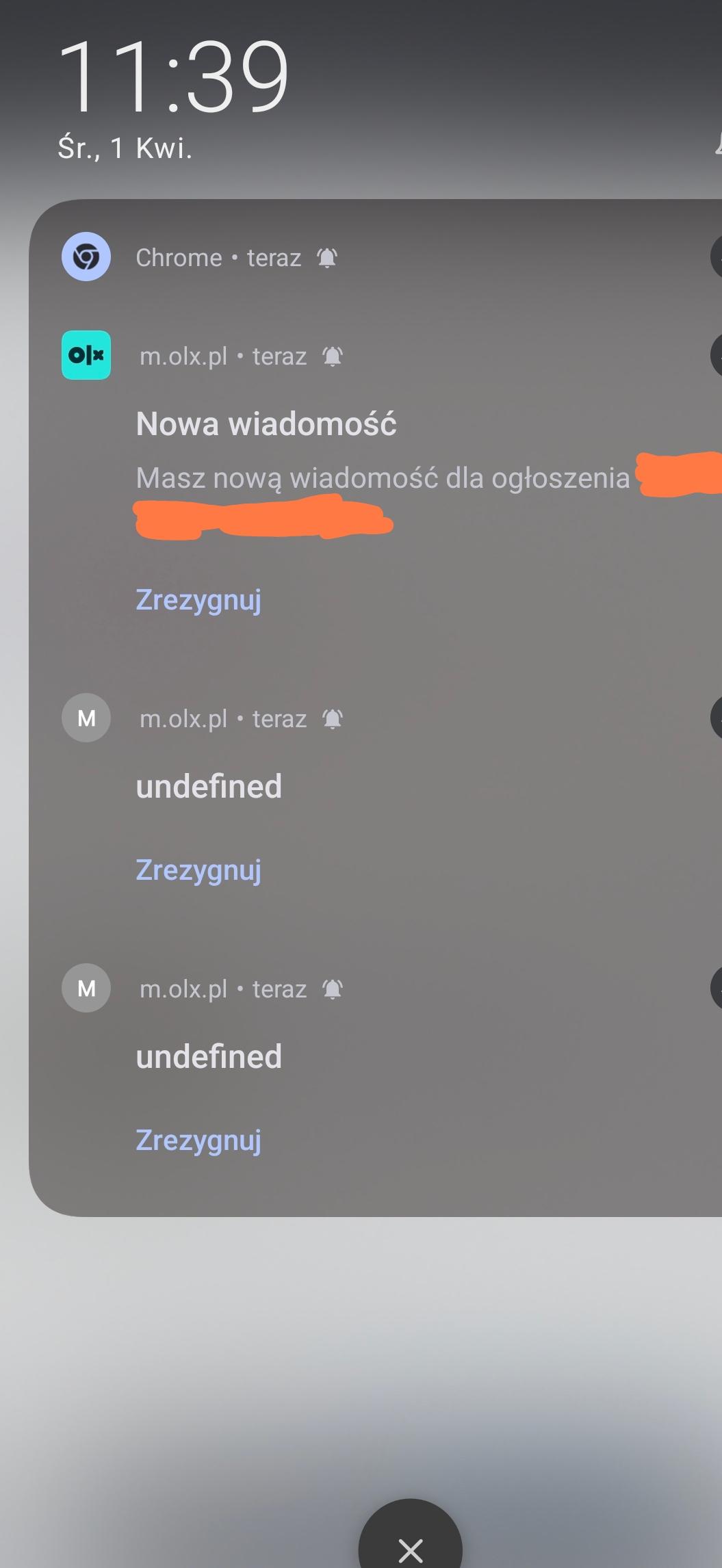 To również nie pomogło. Tak to wygląda, tj. nie ma żadnej treści, jest główne powiadomienie (w tym przypadku z informacją o które ogłoszenie chodzi) i te śmieszne "undefined". Co jeszcze głupsze, to dla każdej jednej wiadomości osobne, mimo, że to jedna i ta sama rozmowa. Jak dam "zrezygnuj" przy którymś z nich, to tracę powiadomienia całkiem...