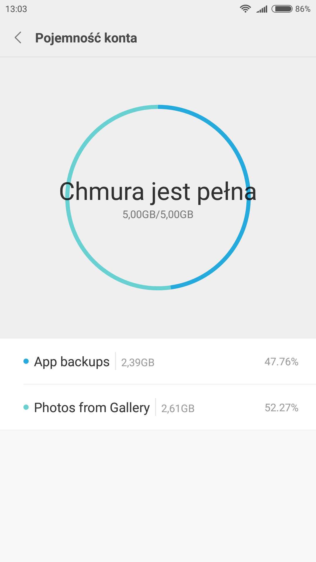Witam. Mam problem z chmurą Xiaomi. Mam kinto standardowe (5GB), a na nim kopię zapasową zdjęć i aplikacji. Dzisiaj pokazało mi się powiadomienie że chmura jest pełna, więc postanowiłem oczyścić ją z kopii zapasowych. Wszedłem na telefonie w ustawienia chmury i kliknąłem odpowiednio, aby usunąć App Backup no i niby usunęło a nadal zapchane. Poniżej screny jak to wygląda w ustawieniach Chmury. Jak to wyczyścić? Telefon to Mi 5 Pozdr