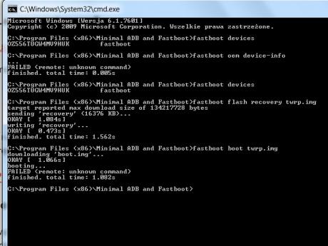 Dzięki jak zrobię z niego cegłę to się napewno zgłoszę a tak to u mnie wygląda, nawet nie działa u mnie komenda fastboot oem device-info, to chzba wina kompa, sterowników lub fomu
