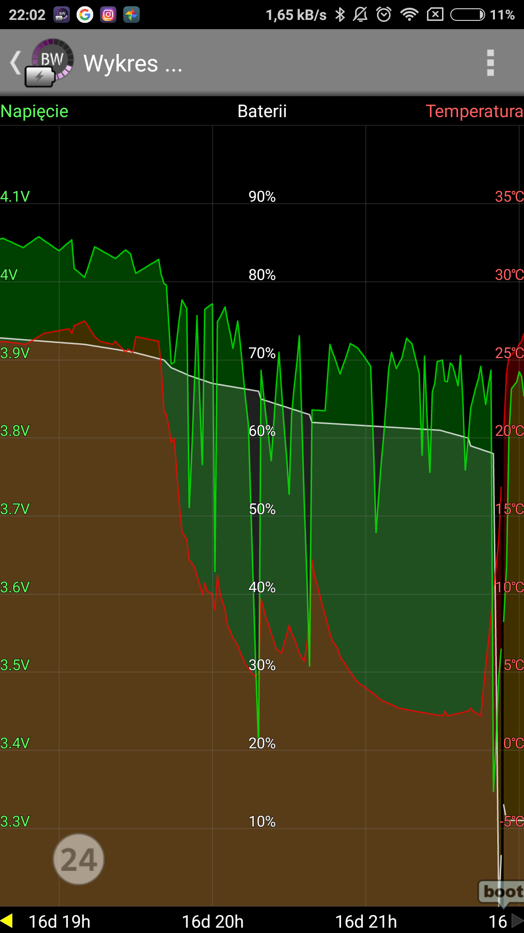 Test zrobiony, zaczynałem od stanu baterii powyżej 60%, wystawiłem telefon na stolik na balkonie i co jakiś czas otwierałem i robiłem zdjęcia - widać jak spada napięcie, delikatnie poniżej 60% naładowania napięcie poleciało na łeb i telefon padł.Po ponownym uruchomieniu bateria na poziomie ok 10-11% Pełna powtarzalność. -