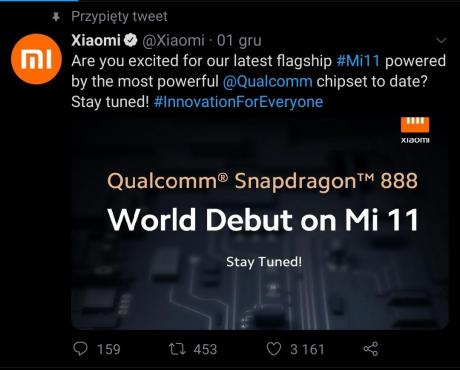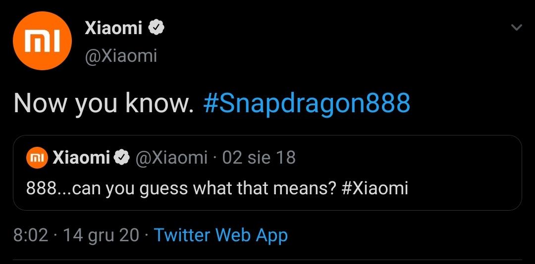 Xiaomi zapowiedziało 2 lata temu swój pierwszy telefon że snapdragonem 888. Tak dobrze czytacie. Chociaż pewnie prędzej sobie dopasowali coś co było zapowiedzią czegoś innego. Na ich oficjalnym koncie na Twitterze pojawił się dziś taki post jak w obrazku niżej. Sama specyfikacja, która pojawia się na różnych serwisach być może jest prawdziwa, ale pewnym jest, że Xiaomi będzie chciało na dniach (obstawiam do 15 stycznia) zaprezentować nowy telefon z serii Mi i będzie na pokładzie Snapdragon 888. Ktoś sprytnie policzył, że może być to 5 stycznia gdyż wtedy wypada 888 dni po opublikowaniu postu na Twitterze z tą liczbą. Wygląd samego telefonu też pojawia się na różnych renderach oraz niby został przyłapany co prezentuje poniższa fotografia. Sama zbliżającą się premiera jest nieunikniona. Jest również anonsowana przez oficjalny profil na Twitterze. Sam miałem rozstać się z marką po 4 latach i trzech modelach (mi 5,8,9), ale mimo błędów w miui nie znajduje dla siebie alternatywy i ogólnie jestem raczej zadowolony więc czekam co z tego Mi 11 będzie bo być może go zakupię.