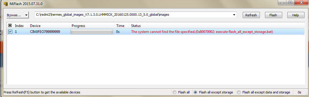 Witam. Mam mały problem z moim Redmi Note 2 :). Ogólnie kupiłem go od polskiego sprzedawcy z serwisem w PL i instrukcja jak system przegrac na MIUI Polska, ale nie chciało mi coś pójść, więc zostawiłem jak jest. Problem pojawił się gdy czyściłem sobie telefon i chyba usunąłem cos ważnego głupio. Telefon włącza się tylko do ekranu ładowania po czym zostaje tak na wieczność i nigdy nie chce się włączyć. Ściągnąłem MIUI PC Suite, ale on nie chce sie połączyc z telefonem, wyszukuje go tylko do 50% i dalej nie chce pójść. Sciągnąłem też MiFlash żeby spróbować wgrać system w inny sposób, ale pokazuje mi się taki o to błąd(screen). Zrobiłem wszystko jak w poradniku tutaj: