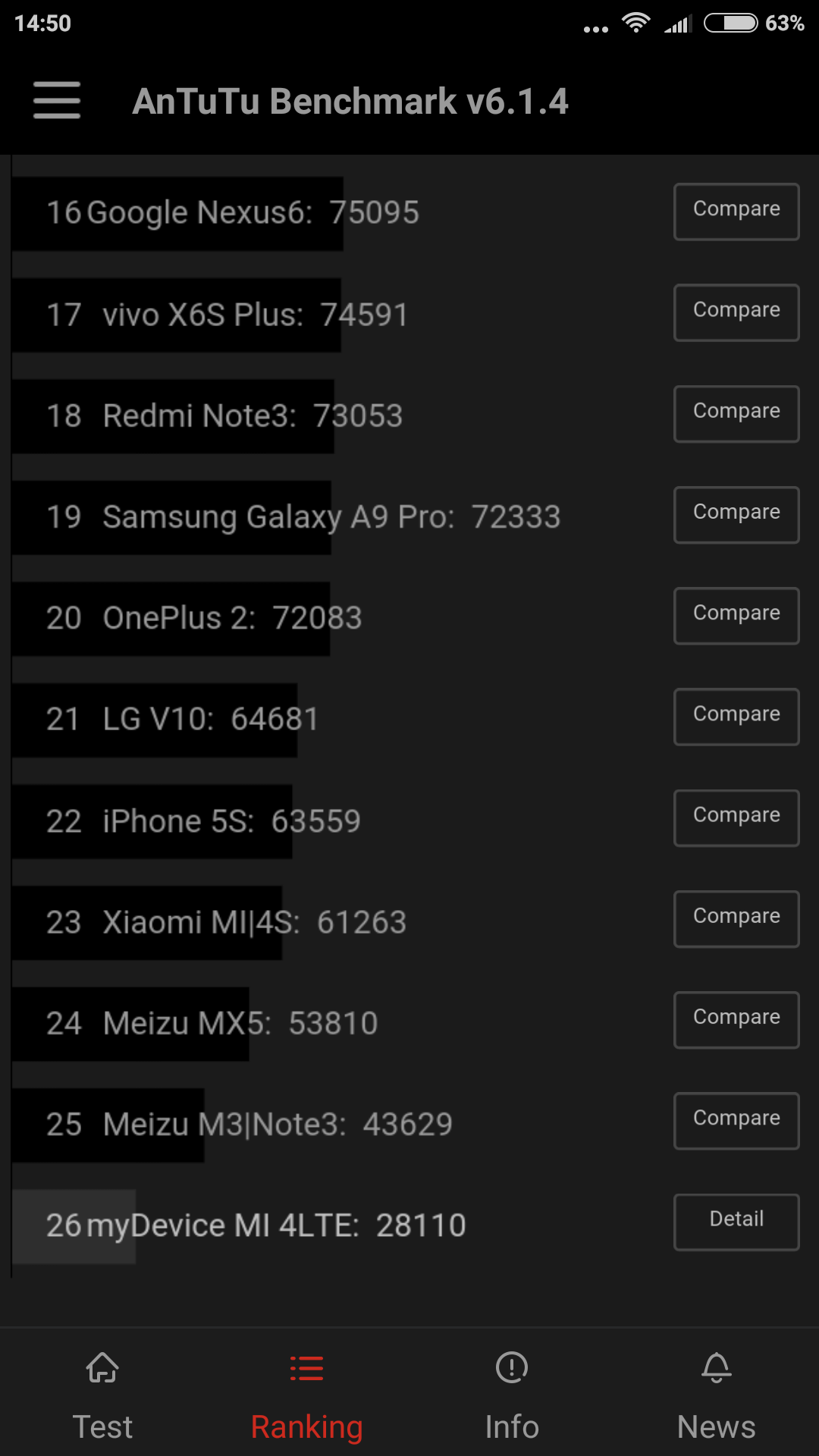 Witam, Ostatnio zakupiłem Mi4 LTE 2GB w sklepie technos-online. Zdecydowałem się dziś, z czystej ciekawości, przeprowadzić ten sławny benchmark Antutu. No i okazało się, że wynik wyszedł chyba dosyć niski. Patrząc w Google, dla tego telefonu wyniki nie schodzą poniżej 40tys. - najświeższy, jaki znalazłem (LINK) zrobił 57181pkt. Mój natomiast telefon zrobił tylko (?) 28110 i na liście porównawczej (którą załączyłem) jest dużo niżej nawet niż Redmi Note3 (który, zgodnie z tymi wynikami, miał 73053). Dodatkowo, w porównaniu do testu z filmiku, który wrzuciłem powyżej, test 3D przebiegał zdecydowanie mniej płynnie. Widziałem także testy innych wersji 2GB i zawsze mają one ok. 47-49tys. I teraz stawiam sprawę jasno - nie wiem, jaki wpływ na ogólne użytkowanie telefonu mają te wyniki, ale skoro mój jest tak drastycznie niższy od innych, to chyba ma to jakieś znaczenie. Jak myślicie, czy powinienem się martwić?