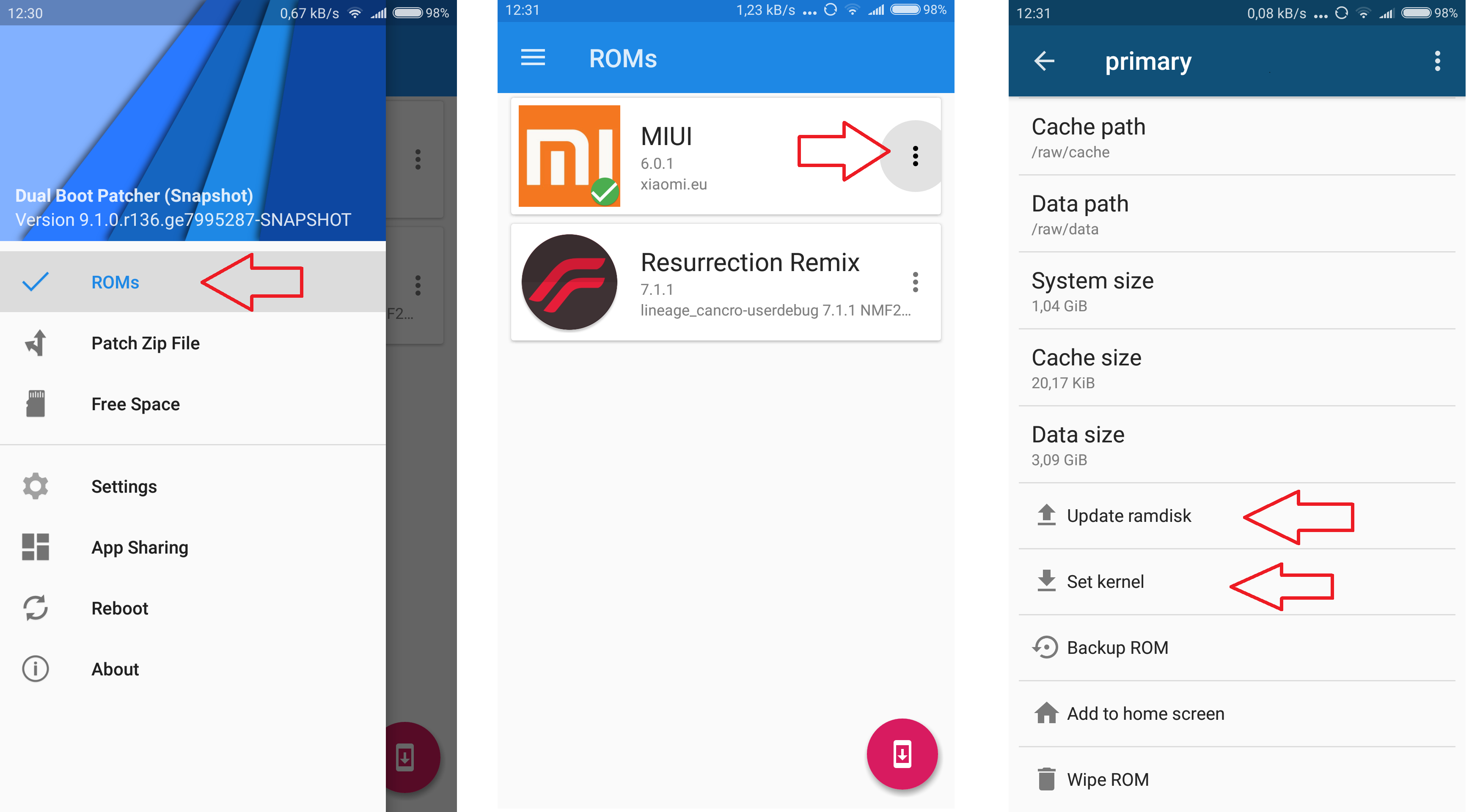 Witam! Ostatnio przeszukiwałem dział XDA w poszukiwaniu modyfikacji MultiRom która umożliwiła by mi uruchomienie dwóch lub więcej Androidów. Głównie dlatego, że dość często testuję różne modyfikacje. Znalazłem dość stary i nieaktualny temat z modyfikacją którą znam. Poprosiłem o aktualizację z racji, że jest to dość stare wydanie. Zostałem nakierowany na DualBootPatcher. Jest to jeszcze lepsza modyfikacja! Testuję od kilku dni i jak dla mnie jest OK. Modyfikacja umożliwia nam zainstalowanie kilku systemów. Dwóch obok siebie na partycji /system (o ile mamy jakiś bardzo odchudzony ROM, w Mi3 tam nie zainstalujemy bo zbyt mało pamięci), /cache (również małą ilość pamięci, niecałe 400MB), /data (ta partycja nas interesuje, największa partycja w telefonie łącząca pamięć wewnętrzną i dane aplikacji), karta pamięci (nasz model niestety, ale nie posiada slotu na kartę pamięci :)). U siebie mam następująco: 1. Podstawowy system - MIUI. Zainstalowany tak jak dotychczas instalowaliśmy aktualizację. 2. Resurrection Remix oparty na Androidzie 7.1.1 - LineageOS. Oba działają bez największych problemów. Można zmieniać kernele dla poszczególnych systemów jak i instalacja modyfikacji w niczym nie przeszkadza. Przejdźmy do poradnika. 1. Musimy pobrać dedykowaną aplikację do obsługi systemów. Pobieramy ją STĄD. (Plik o rozszerzeniu .apk) Po czym ją instalujemy. 2. Aplikacja w tym momencie może nas poprosić o uprawnienia root. Zezwalamy i zatwierdzamy wyświetlone okienko które prosi nasz o modyfikację kernelu. 3. By się upewnić, że wszystko się powiodło to Wysuwamy lewą belkę > Wybieramy ROMs > Wchodzimy w ustawienia ROMu poprzez trzy kropki po jego prawej stronie > Przechodzimy na sam dół i klikamy w "Update ramdisk", zatwierdzamy. 4. Uruchamiamy telefon ponownie. 5. Uruchamiamy aplikację ponownie i przechodzimy w zakładkę Patch Zip File. W tym momencie będziemy patchować wszystkie potrzebne paczki ZIP dla danego telefonu. Rozchodzi się o sam ROM + ew. kernele, modyfikacje i gapps. Po co to robić? Jak wiemy system teraz będziemy instalować w /data a nie /system. Dlatego też trzeba odpowiednie spreparować paczkę tak aby wiedziała, że ma się tam zainstalować i dała znać aplikacji, gdzie system został zainstalowany. 6. Po przejściu w zakładkę klikamy + w prawym dolnym rogu następnie wybieramy Add flashable zip. W tym momencie wskazujemy ZIP ROMu. Po wybraniu wyświetli nam się okno. W Device: analogicznie wskazujemy nasz model telefonu. W Partition configuration: wybieramy Data slot i wpisujemy jakieś ID ROMu. Np. 1 (w moim przypadku 2 bo już mam zainstalowany drugi system a przykład jest na trzecim). Również można podać skrót ROMu by w boot menu wiedzieć który to który (ale o tym później). Klikamy CONTINUE. (!UWAGA! APLIKACJA WYMAGA OD NAS WŁĄCZONEJ APLIKACJI DOKUMENTY KTÓRA DOMYŚLNIE JEST WYŁĄCZONA W USTAWIENIACH > ZAINSTALOWANE) Teraz musimy wskazać gdzie ma utworzyć i o jakiej nazwie spatchowany plik. Teraz analogicznie postępujemy ponownie z GAPPS'ami i innymi modyfikacjamy wymagającymi instalację paczki ZIP. Po tym zatwierdzamy w prawym górnym rogu. 7. Czekamy na spatchowanie pliku ZIP. 8. Powracamy do zakładki ROMs. Klikamy w Okrąg w prawym dolnym rogu zawierający telefon ze strzałką w dół. Teraz klikamy w + i Add patched file. Wybieramy spatchowane pliki ZIP. Zatwierdzamy instalację w górnym prawym rogu. Pomyślna instalacja na końcu zwróci nam zielone napisy, niepomyślna czerwone. W nowszych romach głównie na Nougat instalacja odbywa się w trochę inny sposób, gdyż paczka ZIP sprawdza jeszcze wersję baseband. 9. Powracamy do zakładki ROM's i mamy nasz nowy ROM. Zatwierdzamy go klikając w niego. 10. Uruchamiamy telefon ponownie. System już sam się uruchomi. 11. By zmienić system musimy znowu zainstalować aplikację i wybrać który system ma się bootować. Instalacja NOWSZYCH ROMÓW ( w przypadku gdy aplikacja zwraca błędy instalacji spatchowanego ROMu) 1. Robimy wszystko do podpunktu 7. 2. Kopiujemy spatchowany ZIP na PC. 3. Otwieramy plik zip np. WinRARem i przechodzimy do META-INF > com > google > android. Wypakowujemy plik updater-script i edytujemy go np. Notepad++. 4. Usuwamy #2 linijkę. (assert(cancro.verify_baseband("MPSS.DI.4.0") == "1");) 5. Podmieniamy plik w ZIPie (nie rozpakowujemy tylko na spakowanym) 6. Kopiujemy zip z powrotem na telefon. 7. Instalujemy paczkę jak w podpunkcie 7. Instalacja boot menu (Wersja eksperymentalna i nie zawsze działa) 1. Wysuwamy lewą belkę. 2. Przechodzimy do ustawień. 3. Na samej górze mamy Update boot UI - aktualizaujemy 4. Teraz po ponownym uruchomieniu telefonu powinniśmy mieć boot menu które samo bootuje system po 5 sek. Można również przejść do menu i samemu wybrać który system ma uruchomić.
