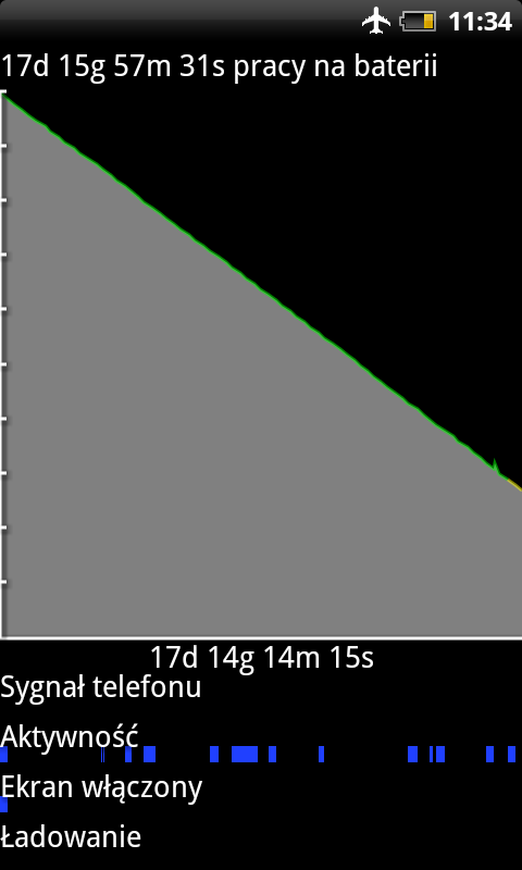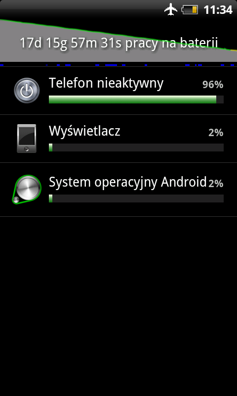 Jakiś czas temu kupiłem za grosze HTC Desire. Ma on służyć jako zapasowy telefon w razie potrzeby. Telefon po pełnym flashu, wgrane tylko kontakty z konta Google. Desire jest wyposażony w: - Android 2.3, - wyświetlacz LCD 3.7" (480×800 px), - bateria Li-Ion 1400 mAh Ma załączony tryb samolotowy i leży w szufladzie 17 dni i 16 godzin:-) zostało jakieś 20 % Moje marzenie - taka wytrzymałość baterii przy pełnym użytkowaniu telefonow.