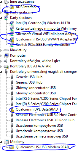 3. Komputer widzi telefon tak jak powinno być ale tu kolejny problem adb nie widzi telefonu ani qpst manualnie tez nie widzi zadnego portu. Instalowałem sterowniki adb minimal adb wszystko z instrukcji. Teraz mam coś takiego.... Jakieś pomysły ? Wszędzie wykrzykniki