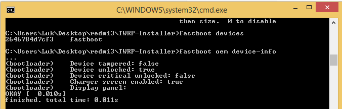 Postanowiłem zatem wgrać twrp, sposobem z tego link z kompendium wiedzy o redmi 3. Wg komunikatów zainstalowało się. Niestety telefon nie uruchomił mi się do recovery, ciągle był w fastboot. Zresetowałem go trzymając volume - volume + i power, i uruchomił się normalnie do zwykłego systemu.