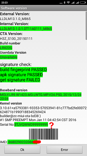 Pytanie czy ten SN należy zapisać dokładnie w takim formacie jak jest na naklejce / pudełku. Czy jest ktoś w stanie (kto nie uwalił NVRAM) podać jaki ma SN wpisany w telefonie, a jaki na pudełku: 1) *#*#6484#*#* -> Software version -> Serial No 2) About phone -> Status -> Serial number -> Serial number Oczywiście proszę zamaskować kilka znaków, podając czy pod maską była cyfra czy litera. Dziękuję.