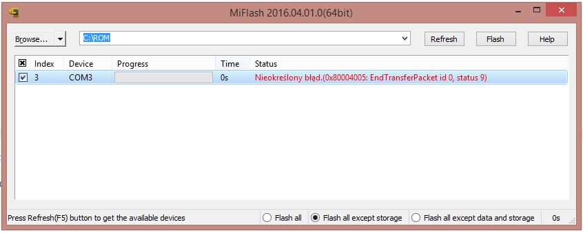 Nie ma właśnie żadnej reakcji. Telefon jest tak jakby wyłączony. Przy podłączeniu do komputera, jest dźwięk wykrycia podłączonego urządzenia i po kliknięciu refresh w miflash znajduje nowe urządzenie ale gdy zaczynam flashować wyskakują takie błędy: -