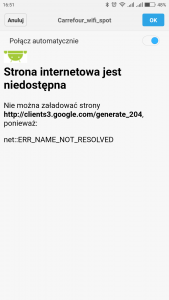Witam, od jakiegoś czasu mam irytujący problem, otóż gdy jestem w zasięgu sieci Hot-Spot ( np.galeria handlowa ) to mimo odnajdowywania takich sieci i podłączania się do nich, otwarcie jakieś strony powoduje wyświetlenie kominikatu takiego jak na screenie, i po chwili wyskakuje powiadomienie brak połączenia z siecią, mimo że w zakładce Wi-Fi oznaczona sieć ma dopisek połączono.