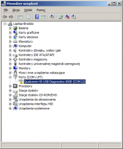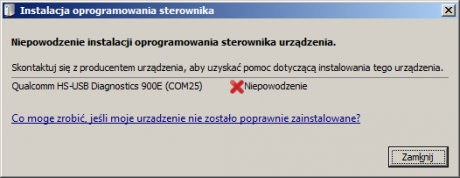 - podlaczony do usb, probuje sie instalowac sterownik "Qualcomm HS-USB Diagnostics 900E". Niepowodzenie instalacji.
