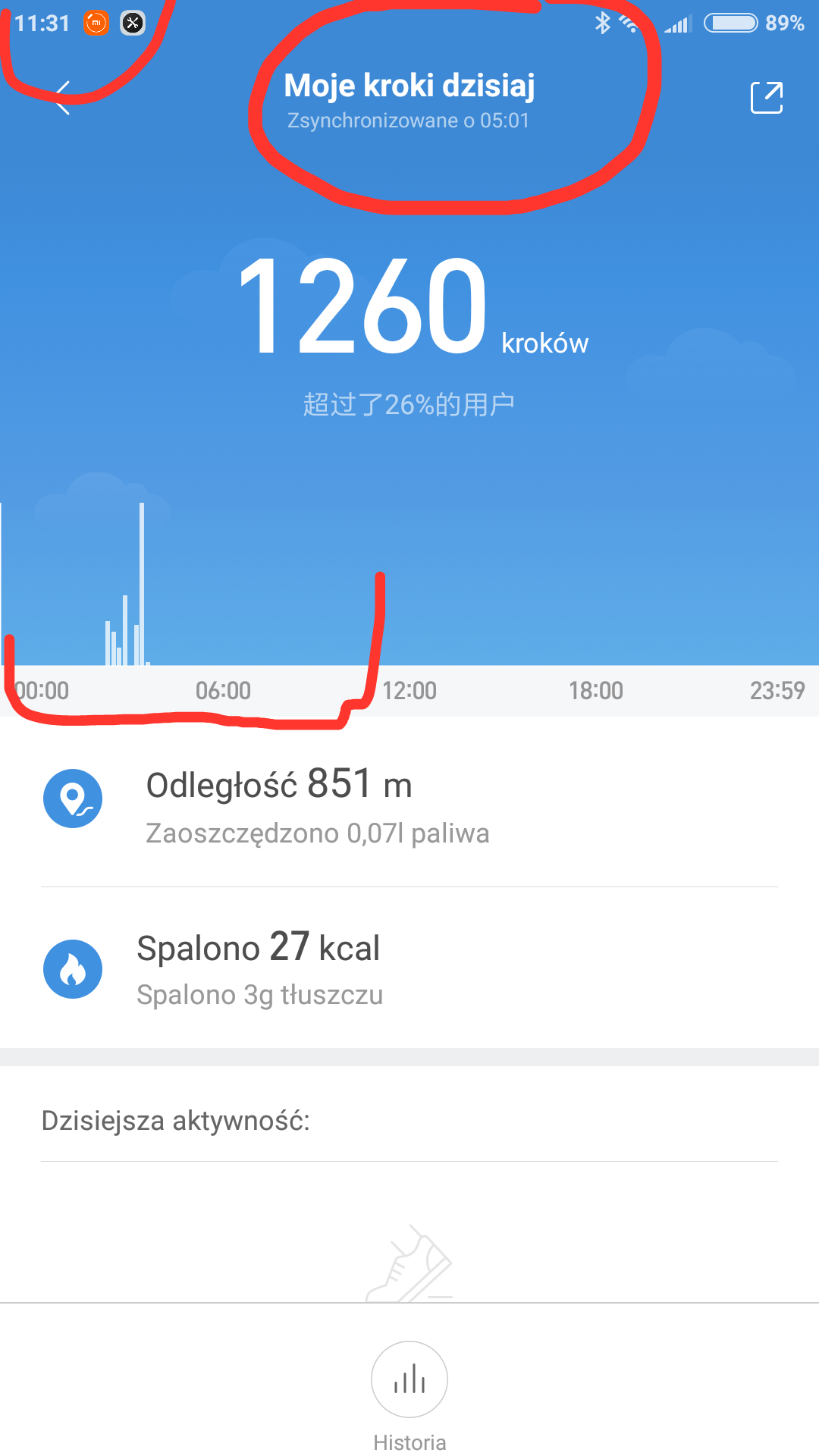 Może ma ktoś pomysł jak przestawić godzinę w mifit która mylnie synchronizuje odejmujac 6 godzin, 30miniut io rzeczywistego czasu? Na zdjęciu moja synchronizacja z godziny. 11:31 a aplikacja pokazuje aktualizowanie o 5:01. O co chodzi?