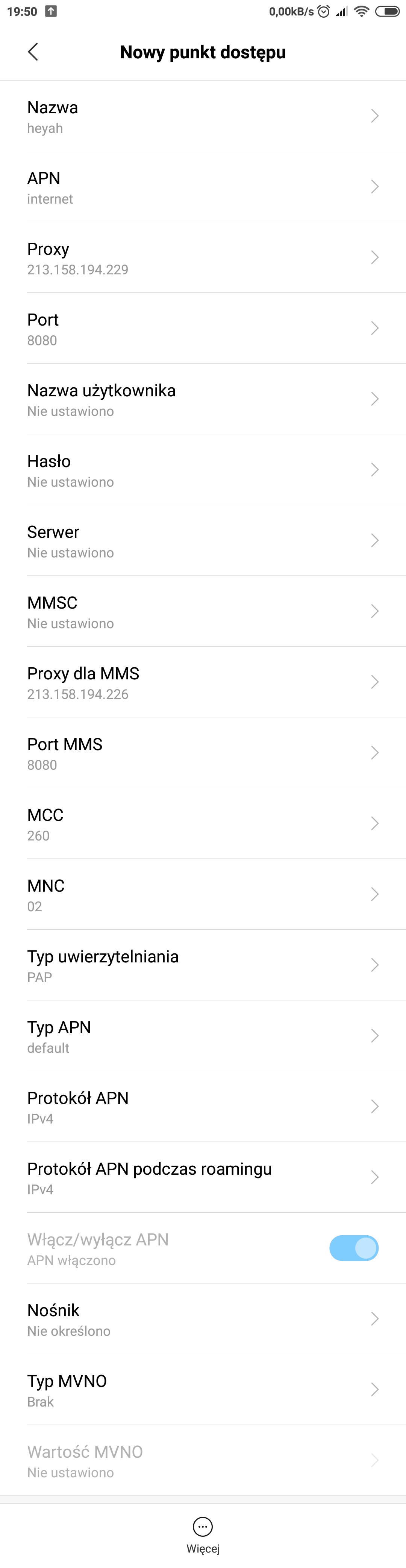 Mogę spróbować, ale wątpię, by to coś dało. Redmi 3S i 4X działają mi w LTE na standardowych, fabrycznych ustawieniach Internetu. Jesteś w stanie podać zrzut jak dokładnie mam wypełnić pola? Nazwy i pozycje z tej strony niestety w dużej mierze się nie pokrywają - http://www.heyah.pl/obsluga-klienta/pomoc/konfiguracja -