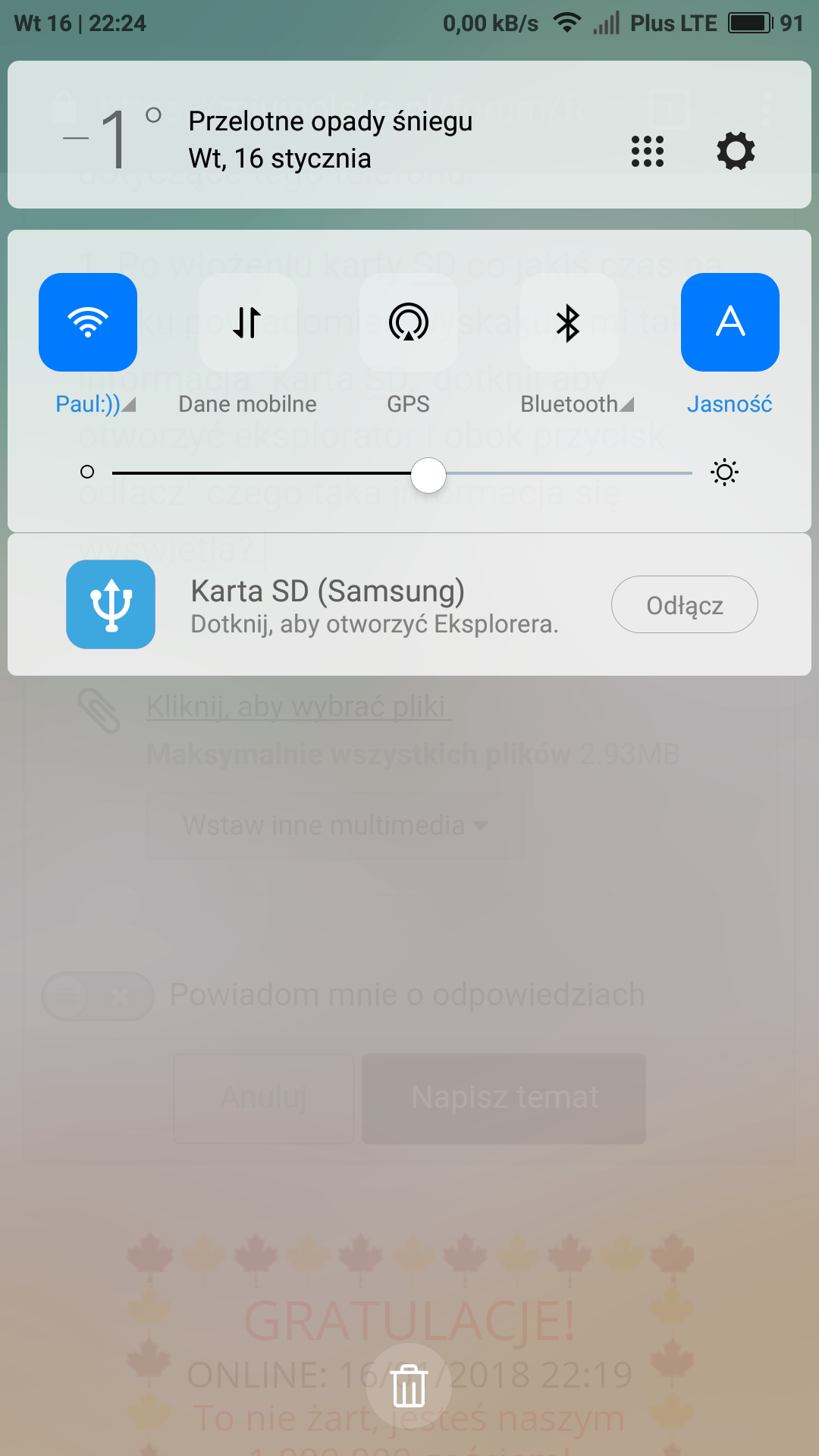 1. Po włożeniu karty SD co jakiś czas na pasku powiadomień wyskakuje mi taka informacja"karta sd, dotknij aby otworzyć eksplorator i obok przycisk odłącz" czego taka informacja się wyświetla?