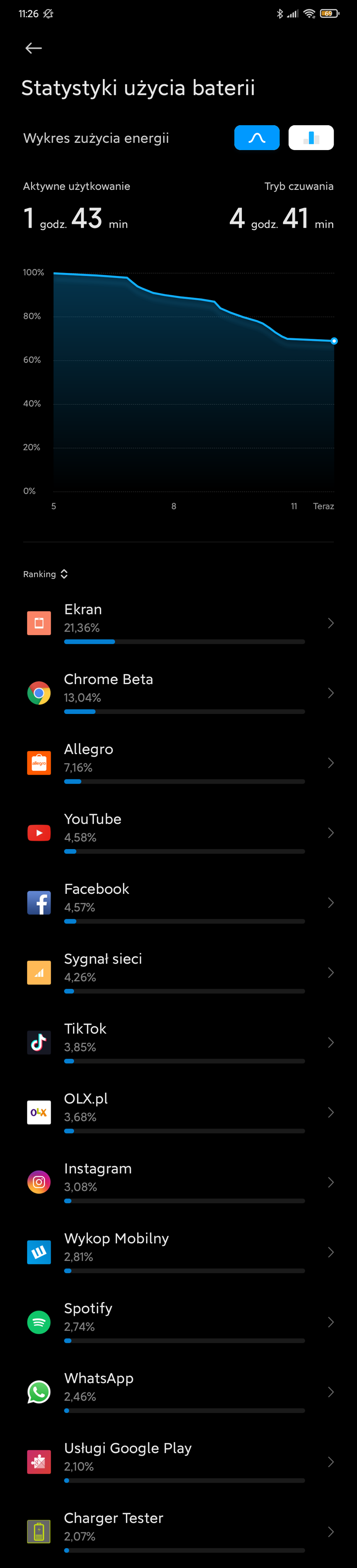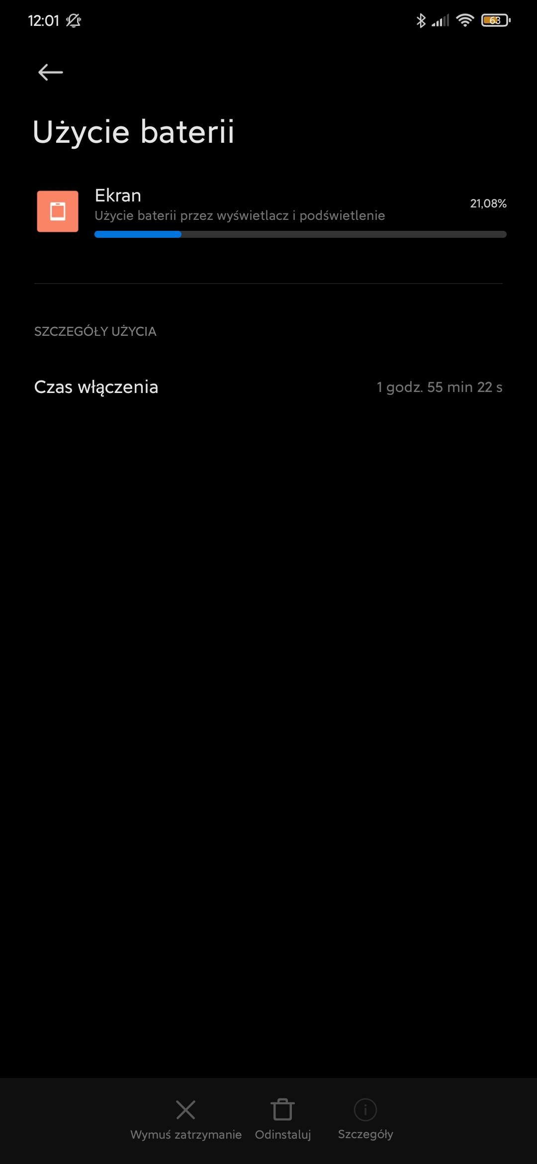Używam MIUI 12, mamy 11:30 a bateria od 6:30 zeszła do 68% gdzie nigdy tak nie schodziła. W załączniku to co może zjadać ale poza ekranem, nie widzę nic niepokojącego. Nie wiem czy to wina MIUI 12 czy czegoś innego. Jak Twój Mi 9? Ile już go masz? Jak z baterią?