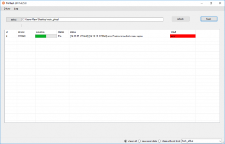 3. Cześć Od paru dni borykam się z tym problemem. Otóż dostałem tel Xiaomi Redmi Note 4 snapdragon wersja global. Próbowałem zworki na pinie 1 i 4 aby wejść w edl itd. Jedyne co osiągnąłem to że widzi mi go w menadżerze urządzeń i miflash lecz tutaj schody się zaczynają. A więc po wybraniu portu przez który idzie flash mam przeważnie 2 komunikaty w załączniku logi. Próbowałem różnych portów, kabli, systemów 7 64bit 10 64bit, ROMów i nadal to samo. Jak były błędy tak są. Ostatnio były błędy z odczytem liczył do 100 i zgrywał kolejny fragment ale byłem na 1B40000 z 88080384 a to był bodajże 3 lub 4 plik z całości. Dodam że jak się podłączy do ładowarki to miga czerwona dioda, nie działa fastboot, nie włącza się jest czarny ekran, wciskanie vol + i - z powerem nie daje nic.