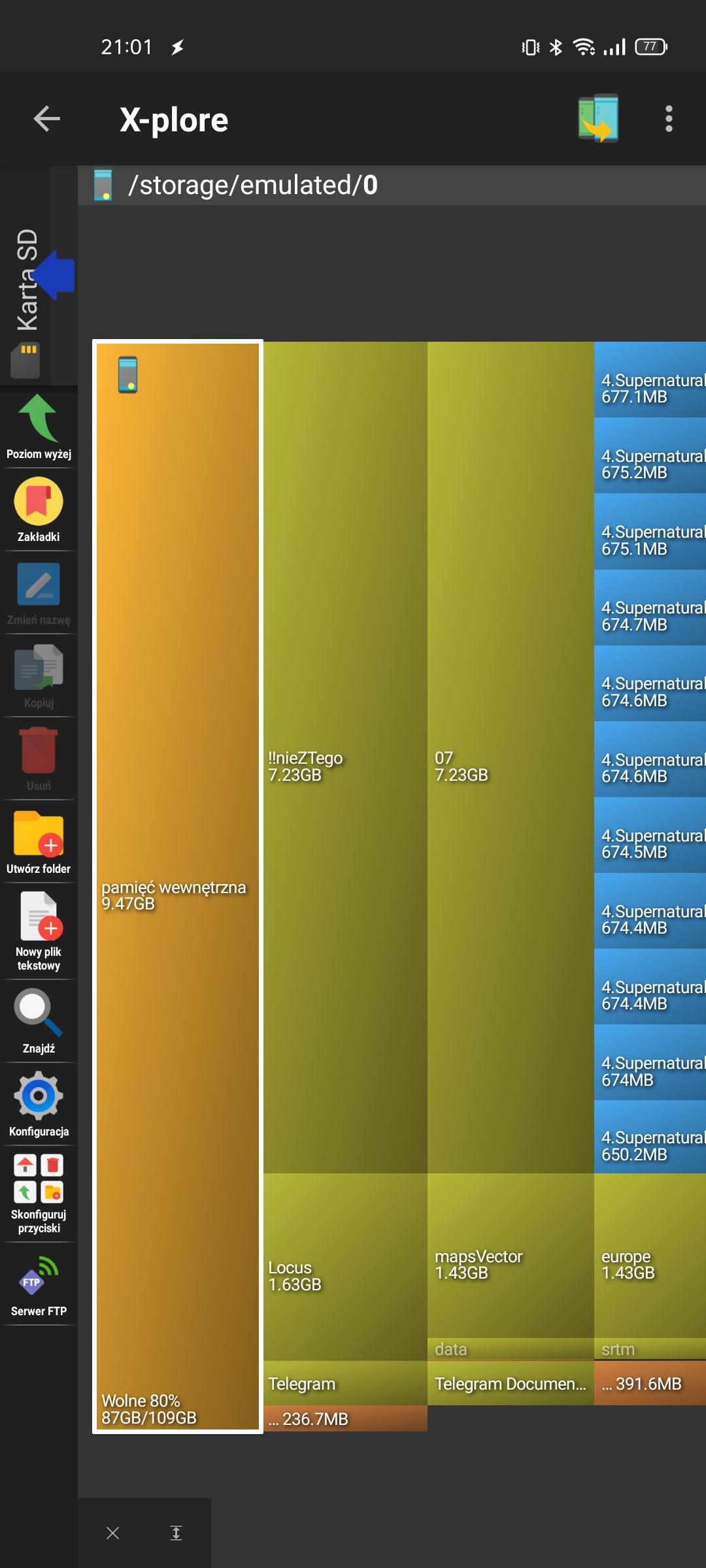 20. Zainstaluj aplikację x-plore. Po uruchomieniu przytrzymaj "pamięć wewnętrzna" i z menu wybierz mapa dysku. Pojawi ci się w formie słupków zajętość telefonu. Wejdź jeszcze do /android/ i kliknij w 3 foldery co tu są. Trzeba nadać uprawnienia do odczytu bo inaczej pominie ten folder. Będziesz ładnie obrazowo widział co miejsce zajmuje.