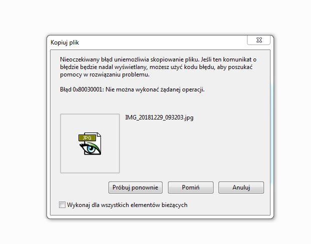 Problem wygląda tak, że kiedy zaznaczam większą ilość plików i przenoszę na dysk twardy ukazuje się błąd (zdjęcie). Jedyna działająca opcja, to klikanie na poszczególne zdjęcie i użycie ctrl+c, ctrl+v (ale kopiowanie 200 czy 300 plików pojedynczo to trochę kiepska sprawa). Nawet przeciągnięcie myszką jednego pliku kończy się niepowodzeniem.