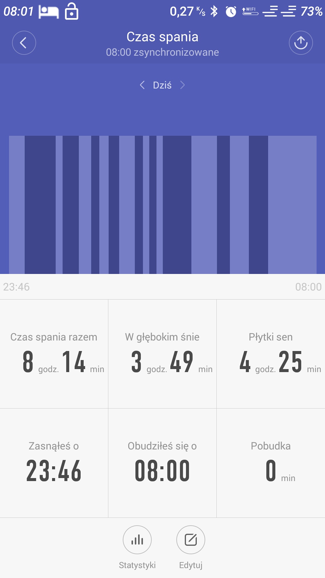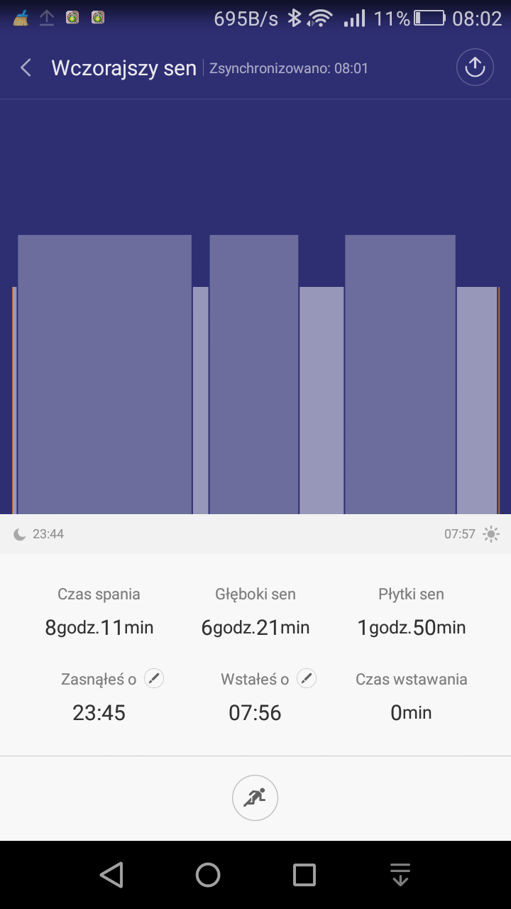 10. Porównanie liczenia kroków pierwszej wersji opaski z najnowszą, cały dzień na jednej ręce, Mi Band z MiFit 1.4.113 firmware 1.0.9.27 (moim zdaniem najlepszy układ dla pierwszej wersji opaski) Mi Band 2 z MiFit 2.1.5 1.0.76 firmware 1.0.0.18 Mi Band Mi Band 2 Podsumowanie nocnych statystyk Mi Band Mi Band 2 Od wczoraj nową opaskę obsługuje też Mi Band Tools, który zakupiłem jakiś czas temu do "jedynki", świetnie rozszerza możliwości obu urządzeń. Z funkcji które mnie się podobają to: - możliwość cyklicznych pomiarów tętna - rozszerzony zestaw ikon - dodatkowe wibracje przed właściwym powiadomieniem - prawdopodobnie działający inteligentny budzik, ale tu jeszcze nie wiem na 100%, bo dzisiaj obudził mnie 5 minut przed czasem
