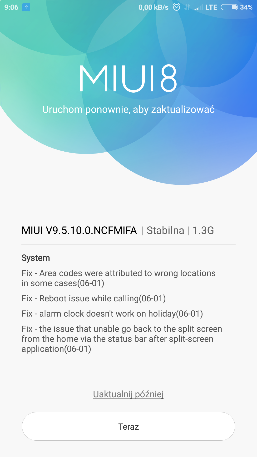 Witam. Mam problem, mam aktualnie system MIUI8 i jest dostępna aktualizacja na xiaomi redmi note 4. Normalnie pobieram aktualizacje, rozszyfrowuje się, po czym pyta czy uruchomić ponownie telefon. Wybieram opcję uruchom ponownie po czym telefon włącza sie spowrotem i wyskakuje informacja że nie pełny ROM czy coś w tym styly. Jak to naprawić?