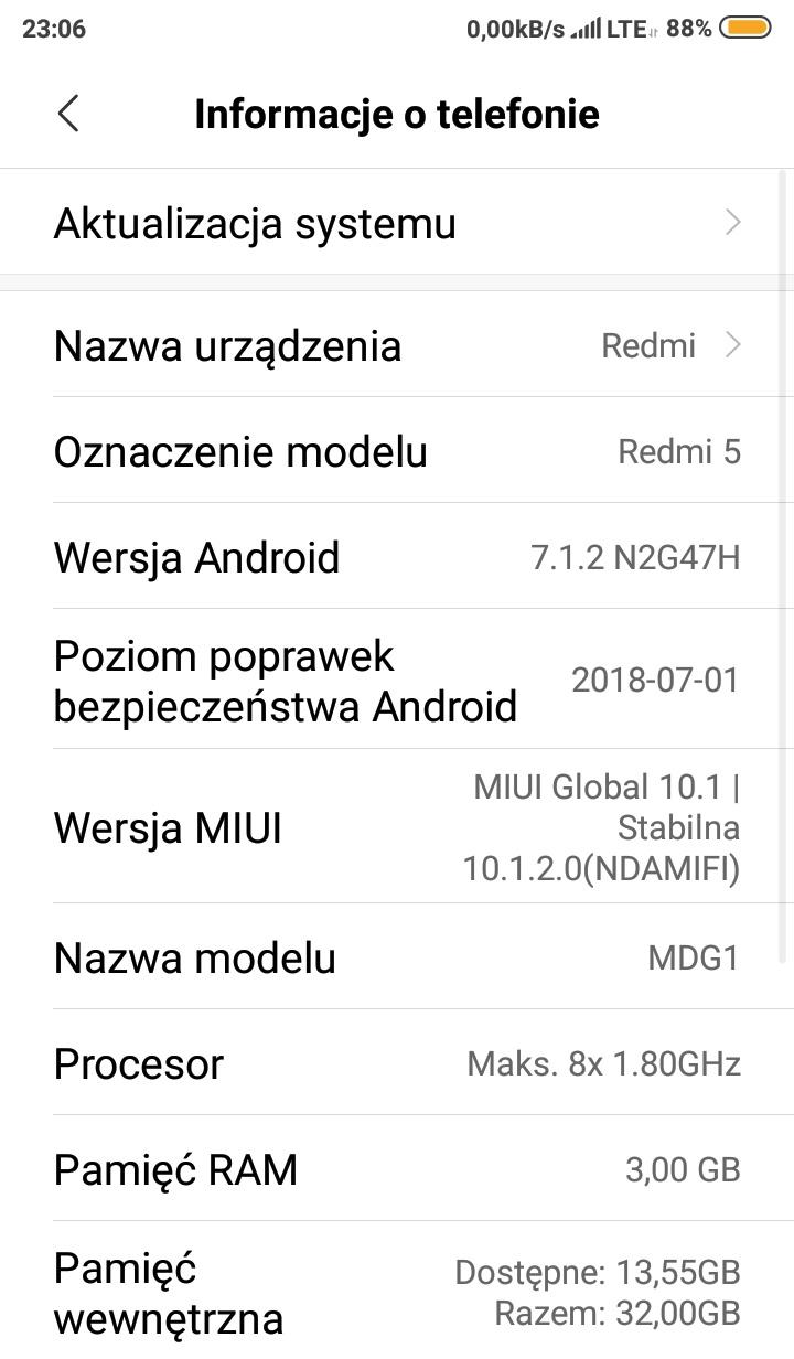 1. Cześć, Prosiłbym o podpowiedź czy wersja androida w moim Redmi 5 jest prawidłowa. Czytałem trochę informacji na tym forum ale również na innych stronach, z których wynika, że część użytkowników posiada Oreo a zapowiadane są nawet aktualizacje do Pie. Nie chodzi mi o użytkowników, którzy sami wygrywają systemy itp. Poniżej przesyłam wersję jaką posiadam. Z góry dziękuję za odpowiedź i pomoc. Pozdrawiam.