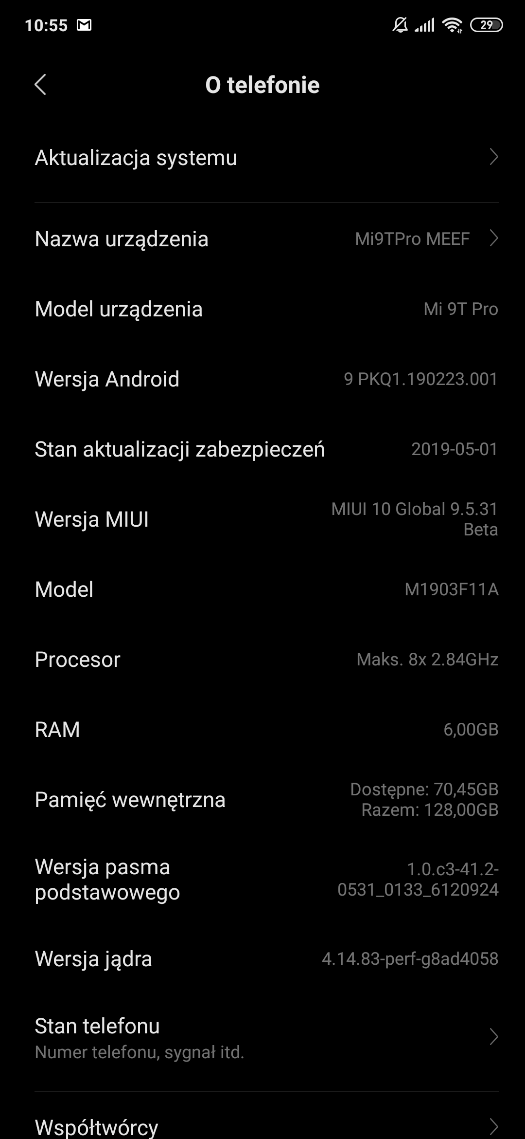 Adamrezo mój też był jako mi9t pro. Wgrałem xiaomi.eu i jest jako redmi K20 pro. Względem global bety która miałem jak i ty jest kilka różnic. Inne logo blogowania, podczas otwierania przedniego aparatu animacja na krawędzi ekranu, trochę inne ikonki i parę ustawień których w necie nie było. Jest też więcej opcji trybów sieci. W globalu nie widoczny był w ogóle 2g. Teraz jest. Póki co tyle. Testuję dalej -
