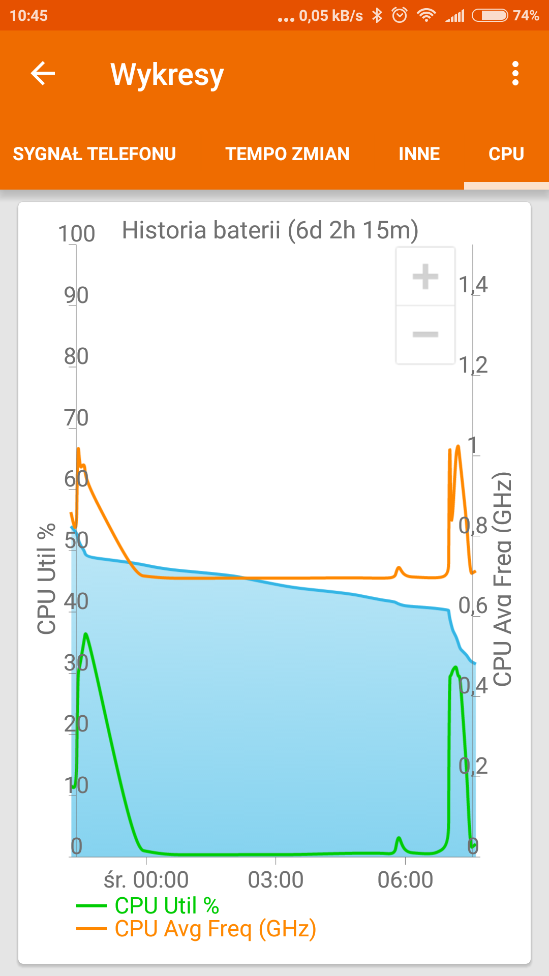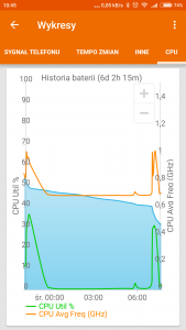 Powinno się patrzeć na ten zielony wykres czy pomarańczowy. Dopiero teraz zobaczyłem, że min taktowanie wynosi ~600MHz Może tak pokazuje apka, dlatego że nie ma uprawnień root? Apka to Wakelock Detector LITE, bo nie mam roota. Ok, zainstaluje CPU Spy Dziwne, bo teraz ta apka GSam Battery Monitor na wykresie pokazuje wartości od zera. Być może dlatego, że zainstalowałem CPU Spy Ss teraz wygląda inaczej, w deep sleep chyba przeszedł Redmi Na co zwracać uwagę: zielony czy pomarańczowy.wykres?