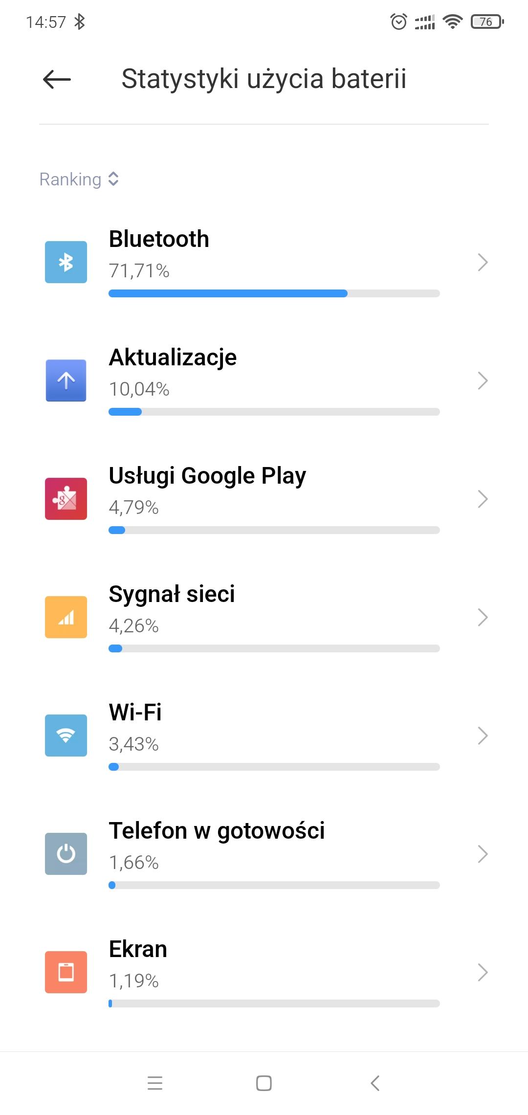 Mam problem z drenowaniem baterii przez Bluetooth - używam mi band 3 z aplikacja mi fit. Na poprzednim telefonie (miui 10) użycie baterii przez bluetooth było minimalne, wręcz niezauważalne. Używałem mi 8 lite z miui 11 - bt drenuje baterię na ok 80%, zmieniłem na miui 12 to samo (poniżej screeny). Mam ustawioną opcję oszczędzania baterii oraz autostart aplikacji mi fit (na poprzednim telefonie miałem tylko autostart aplikacji mi fit). Czy ktoś miał doświadczenie z taką sytuacją? Bo dla mnie to dyskomfort, że nie mogę w pełni wykorzystać potencjału sprzętu, bo albo mi bateria szybko pada lub muszę wyłączyć bluetooth. Chyba, że mam powrócić na miui 10. Coś wywołuje ciągle pracę bt na tym systemie. Chyba, że to normalne, że bluetooth na tym telefonie używa 80% baterii.