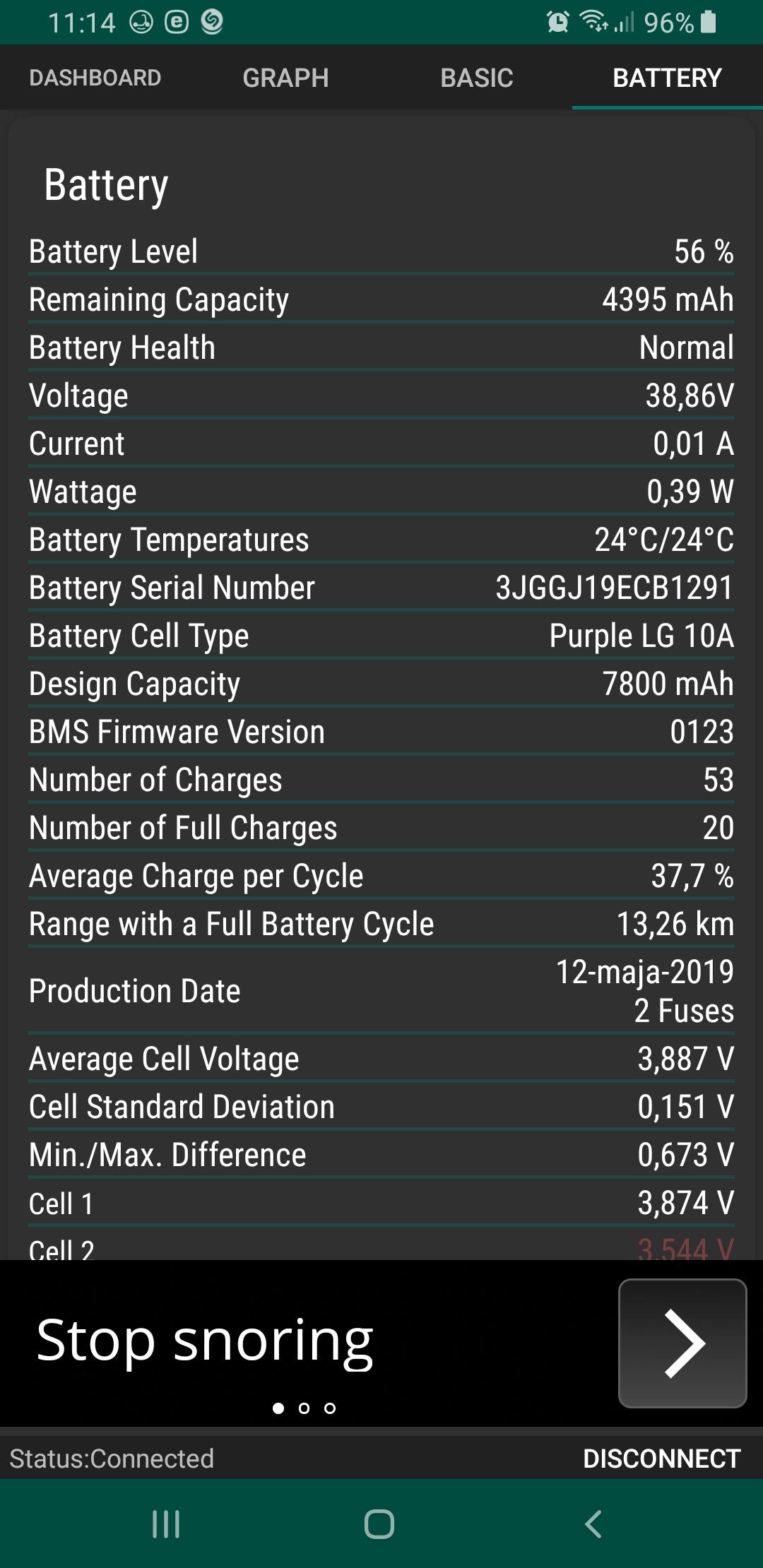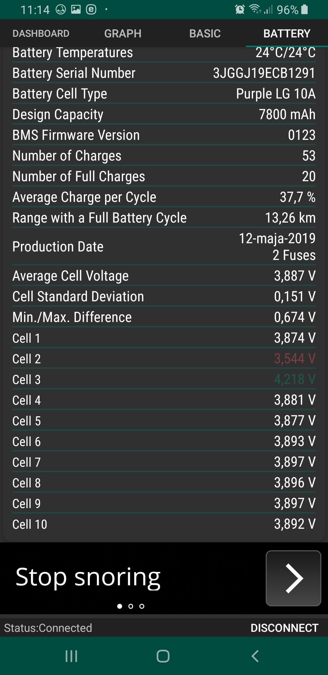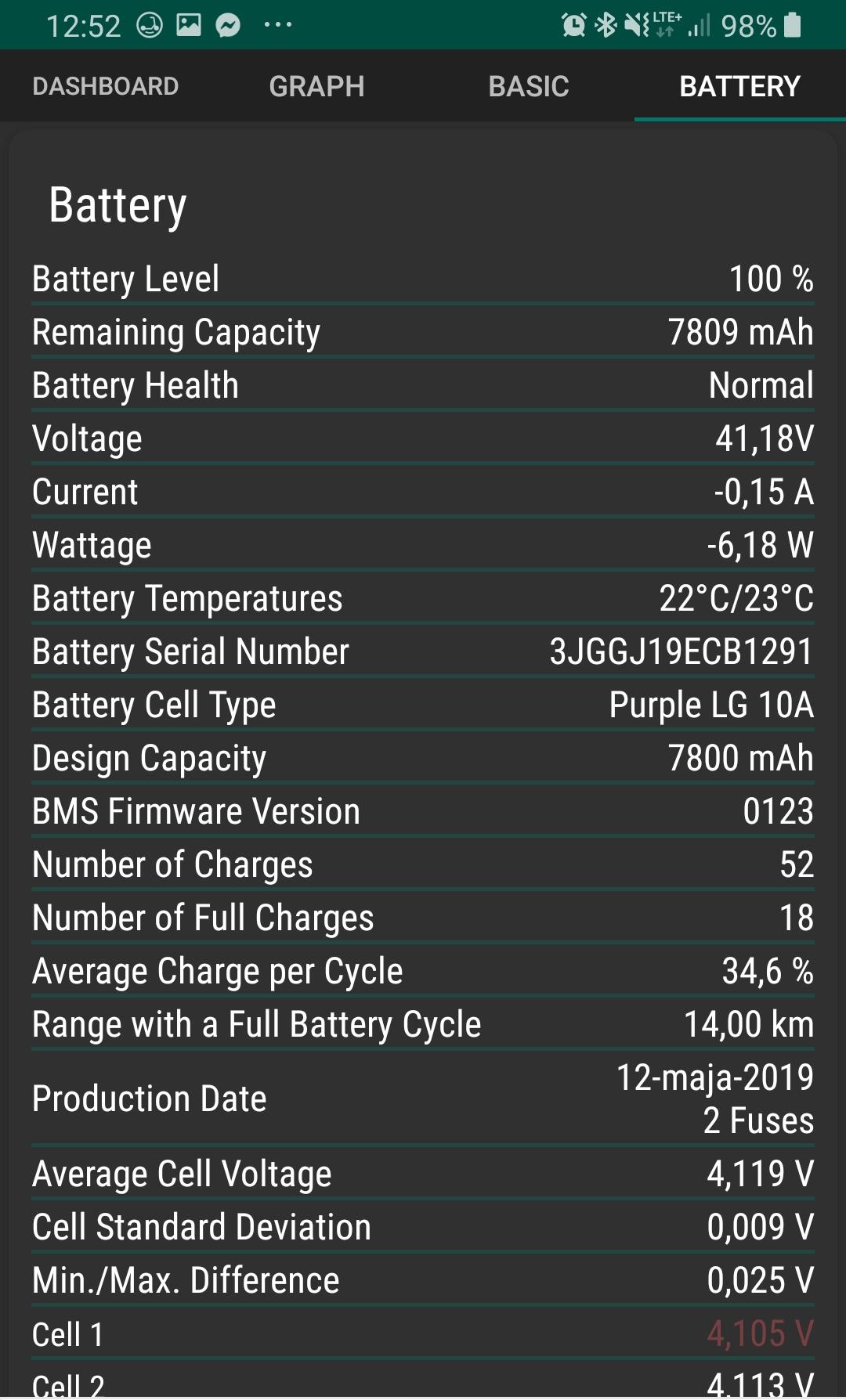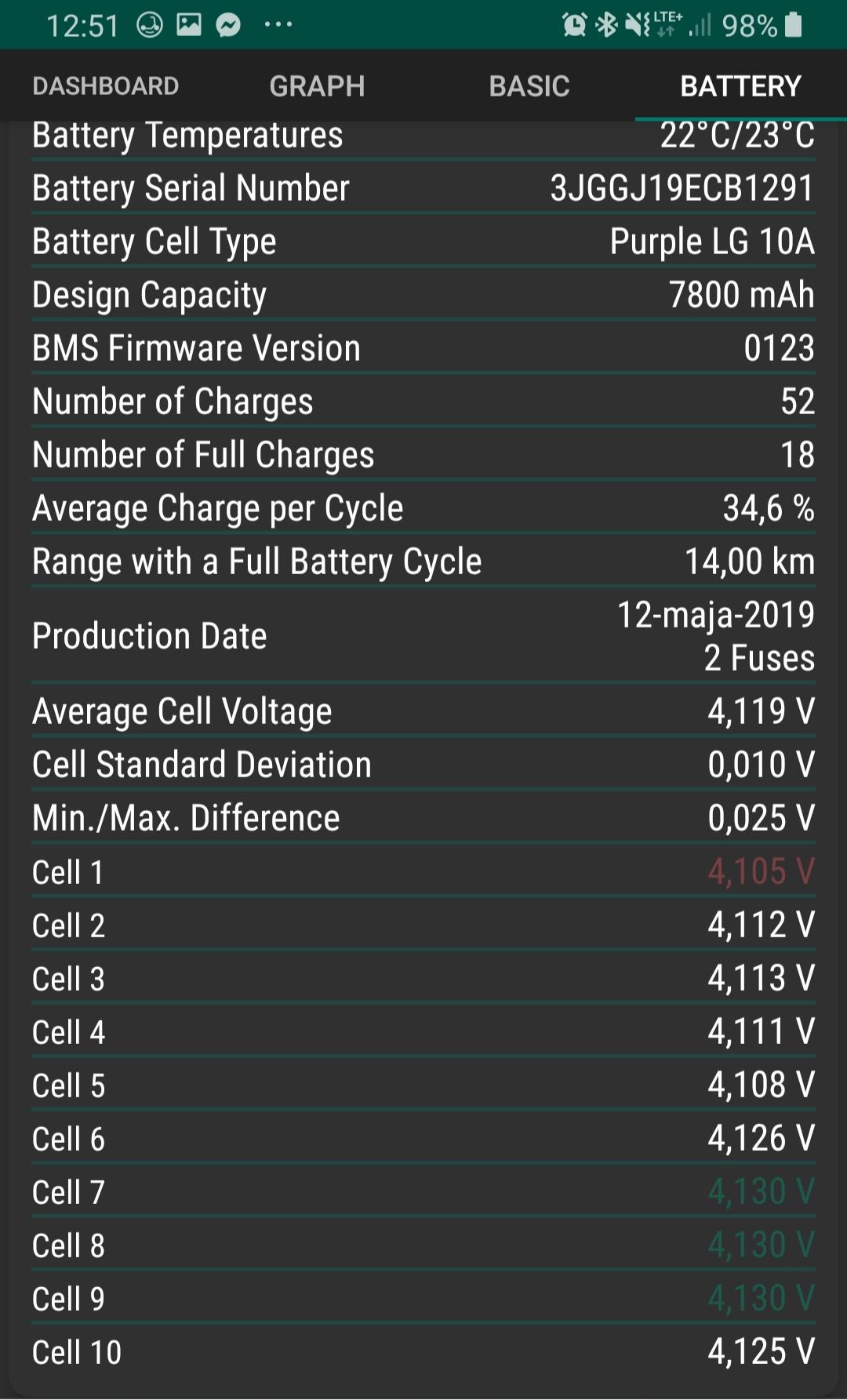 3. Cześć wszystkim. Mam problem i chyba nie typowy bo nie znalazłem podobnej sytuacji z moja m365. Kupiłem używaną, jeżdżę pół roku, przejechane ma 390km, ESC 0151, Ble 0081, BMS 0115. Oststnie dane z baterii jak na zdjęciach. Ostatnio pojechałem do znajomego, trasa 2-3 km, głównie gładkie chodniki ale i podjazd pod wiadukt ze średnia prędkością 15km/h a max 24km/h. Naładowanie baterii przy starcie 73%. Na miejscu wyłączyłem ją i po 1h chcąc wrócić do domu włączyłem hulajnogę, stanąłem na podeście i się wyłączyła. Klikanie w włącznik nic nie dawało więc pod pachę ją i do domu. W domu podłączyłem ją pod ładowanie i na chwile jakby próbowała się włączyć ale cóż... Resetu też nie idzie zrobić... Sytuacja widoczna na filmiku. https://youtu.be/3JyWZT7Jep8 Szczerze nie znam się na takim grzebaniu, podejrzewam że to coś z baterią i mam zamiar ją wyciągnąć. Jak ma ktoś jakieś pomysły jak ja zdiagnozować w domu będę wdzięczny.