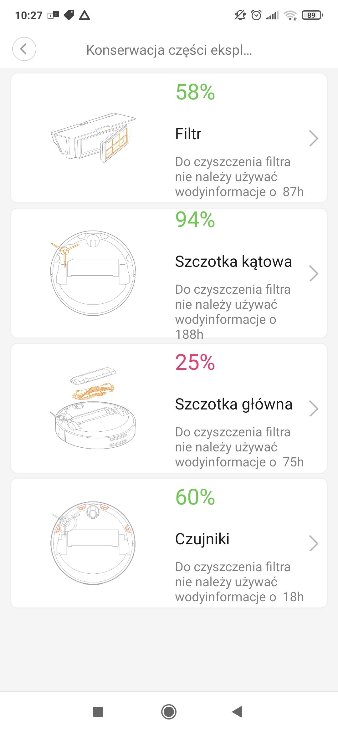 1. Od 2 tygodni mam Vacuum Mop Pro (EU). To mój drugi odkurzacz od Xiaomi, poprzedni to 1. generacja. Ogólnie jestem zadowolony, ale brakuje mi w aplikacji Mi Home kategorii "konserwacja". W poprzednim odkurzaczu mam taką zakładkę. Czy da się gdzieś sprawdzić ile godzin pracy zostało do wymiany części eksploatacyjnych?