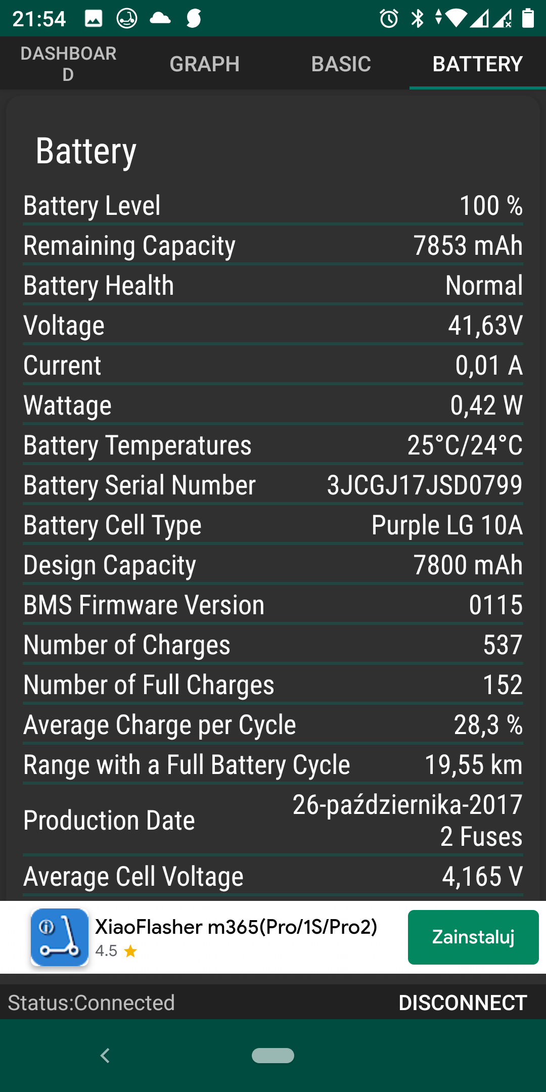 2. O, jednak hulajnoga jest nowsza niż pamiętam Czy te dane (np. ilość cykli) są resetowane kiedy resetuje się hulajnogę? Bo była zresetowana kiedy aplikacja przestała się z nią łączyć.