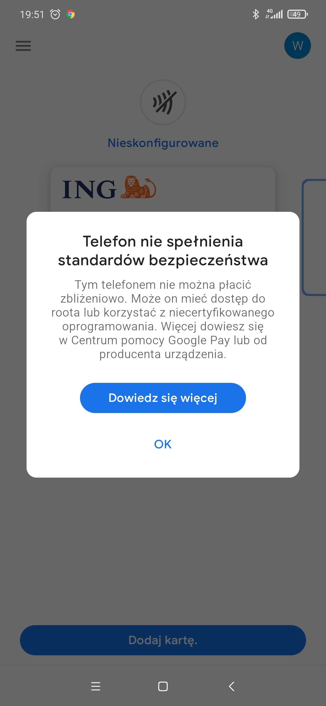 1. Dzień dobry Mam problem z płatnościami NFC. Dotychczas wszystko było bez problemów, podpięta karta ING do Google Pay, ustawione jako domyślna płatność. Dziś około południa dokonywałem płatności - bez problemów. Kilka godzin później już nie mogłem zapłacić, komunikat jak w załączeniu. Naprawa z poziomu ustawień NFC i ponowne uruchomienie telefonu nic nie pomogło. Proszę o pomoc w rozwiqsniu problemu i wyjaśnienie co może być tego przyczyną? W międzyczasie nic nie aktualizowałem ani nic nie zmieniałem w ustawieniach. Nie wiem o co chodzi. Mi9 MIUI by xiaomi.eu 12.0.5