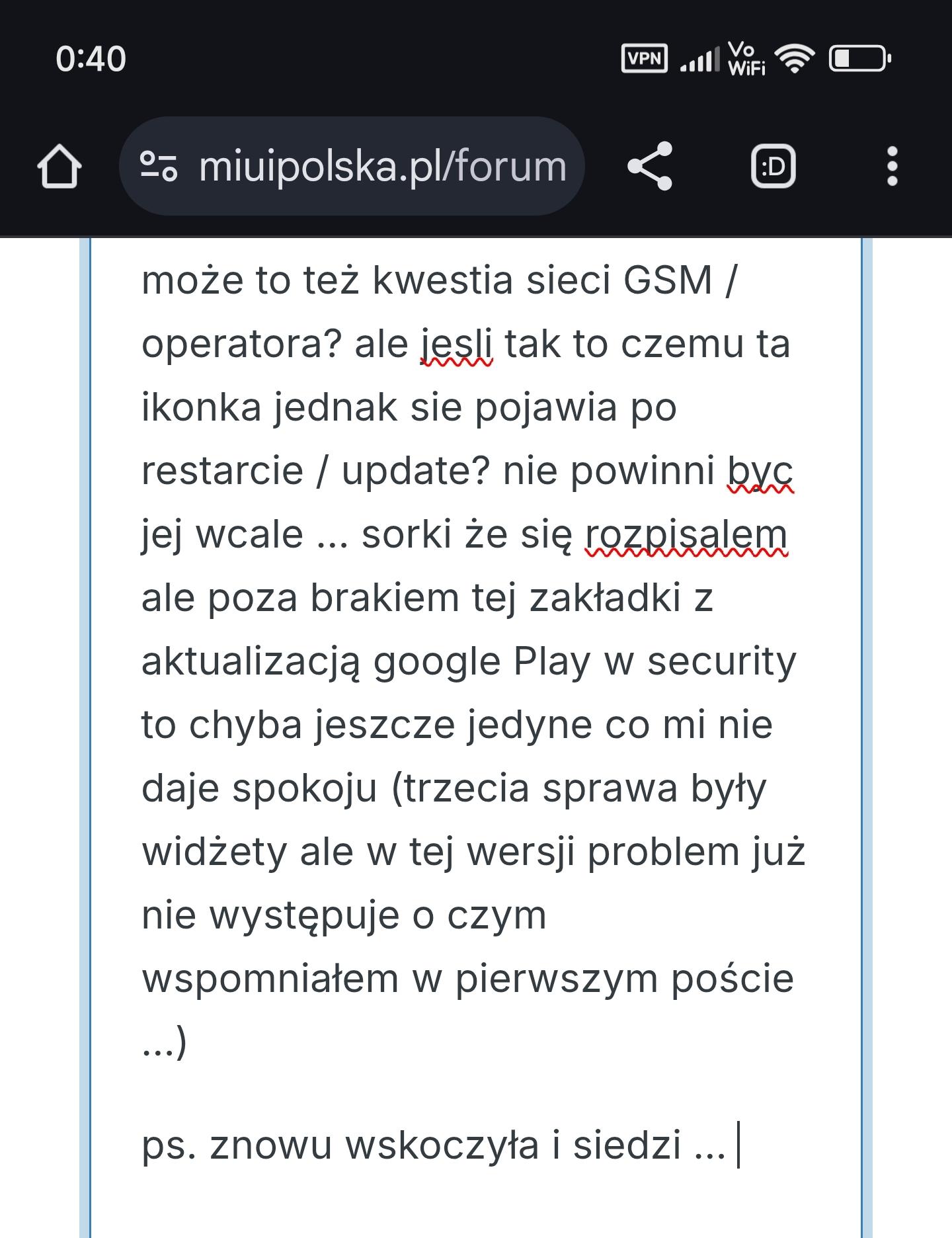 juz pobieram ... normalnie z serwera bo przez updater nie idzie sie wbic ... w ogole to sie zastanawiam po co oni wypuszczali ta poprzednia wersje 2.1 - build 122 - skoro tydzien pozniej wskakuje juz 2.2 ... no nic ... jak wrzuce i obadam to bedzie update ... mam nadzieje ze jest duzo do poprawy ... jak wszystko bedzie luks to nudno troche bo nie ma o czym pomarudzic na forum wrzucone w fona - na razie wyglada dobrze ... jak bede mial chwile i sie ogarne z robota to wrzuce wiecej infa ... poki co trzeba robic za grosze na kapitaliste ... pierwsza uwaga to poprawki zabezpieczen od Xiaomi z maja - zakladki z poprawkami od Googla dalej nie ma ... ikonka vowifi dalej robi swoje (czyli ladnie po upodacie wskoczyla tam gdzie trzeba a po kilku minutach zdechla ... o dziwo wrocila na swoje miejsce i jest widoczna nawet przy marnym zasiegu wifi ... zobaczymy co bedzie dalej - a dalej jest bez zmian ... raz jest raz nie - czyli tu bez zmian w porównaniu do wersji 2.1) ... widzety na swoich miejscach - czyli jest ok (pisalem tez ze bylo juz ok na ostatniej wersji 2.1) w galerii pojawily się w końcu te trzy kropki i można pobrać wtyczki do edytora SI - załącznik w pasku statusu można dodać ikonkę budzika - to powinno wielu ucieszyć bo było narzekanie na to w paru wątkach ... można też wyłączyć wskaźnik prywatności - to samo co powyżej 🙃 tłumaczenia dla AI subtitles to pan Kacper w temacie ... nie będę tu nic wrzucać ... ps. co mi jeszcze wpadło w oko to wywalenie certyfikatu w sklepie Play - w poprzedniej wersji był ... załącznik ps2. jeśli kogoś interesuje pełny changelog to w oryginale jest tutaj https://miuiver.com/xuanyuan-v2-0-203/ można sobie wrzucić do translatora i obadac ... albo użyć opcji tłumaczenia w przeglądarce ... Chrome ma takie coś ... nie wiem jak inne bo praktycznie korzystam tylko z Chroma 🙃 -