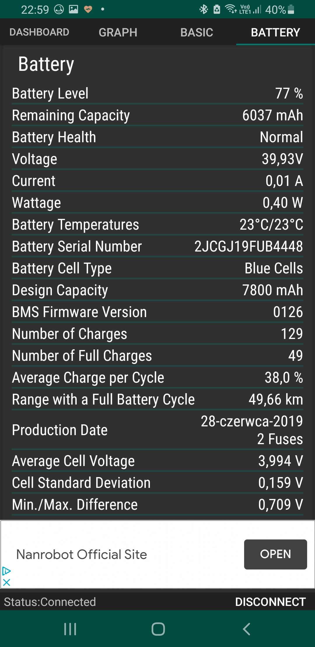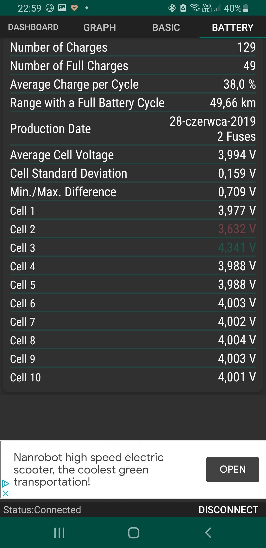 Odpiąłem kabelki od baterii sprawdziłem czy wszystko ok. Zobaczyłem, że mała blaszka na baterii(taki kwadracik) z boku nie trzyma się. Wydaje mi się pod wpływem drgań odpadł. Jes ich tam kilka, sprawdziłem wszystkie. Nie mam spawarki/ zgrzewarki do baterii więc przylutowałem. Podłączyłem do prądu działa. Ładuje do 100% nie tak jak wcześniej, że było max 73-78% w aplikacji. Przejechałem się wczoraj mogę zrobić 50km tak pokazuje apka. Bateria jest nowa tylko ta blaszka oderwana była dlatego były w aplikacji takie różnice napięcia.