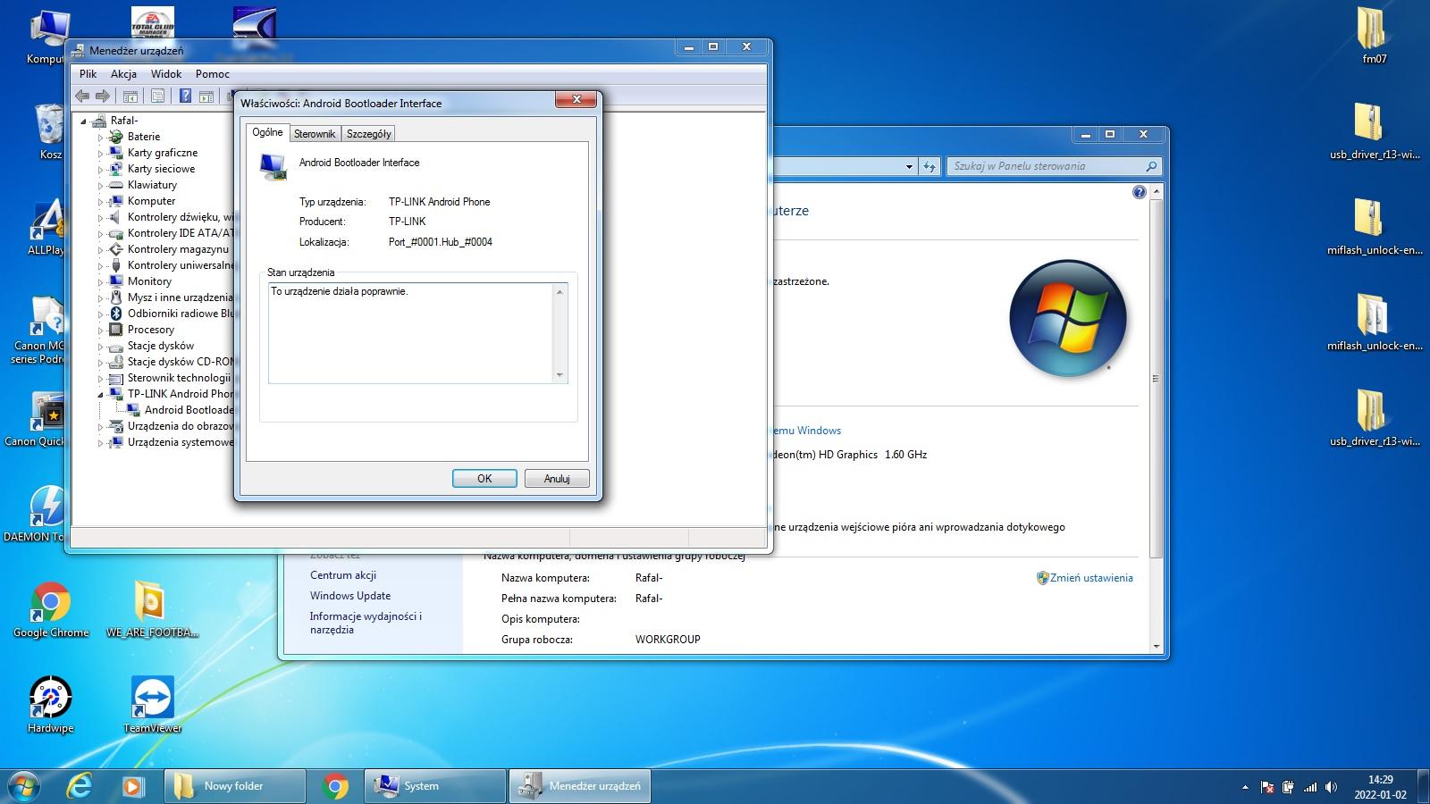 Oryginalnie byl zainstalowany chinski rom jaka dokladnie nie jestem pewny i obecnie nie mam jak sprawdzic?! Czyli moze zlego twrp uzywam i dlatego telefon nie chce sie uruchomic? Chociaz troche to dziwne ze za pierwszym razem na tym samym twrp telefon ruszyl, co prawda byl w jezyku chinskim ale udalo mi sie go zmienic na jezyk angielski. Uruchamiam fastboot w telefonie, podpinam do komputera i slysze dzwiek wykrycia telefonu przez komputer. Sterowniki moze sa zle ale czemu za pierwszym razem ruszylo? Zalaczam screen z managera urzadzen komputera z podpietym telefonem