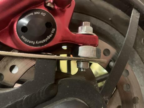 Jako, ze przyszedl do mnie juz jakis czas temu sam zacisk bez adaptera, a nie dawalo mi spokoju jak to wszystko bedzie wygladalo zawitalem do sklepu marki Obi i zanabylem takie oto cos: Rozstaw otworow niemal idealny (odrobina roboty pilnikiem zeby dopasowac) i viola: Po dodaniu tego: nastapil burzliwy etap pasowania... Po ktorym doszedlem, ze min wysokosc dystansu pomiedzy zaciskiem, a tym wspornikiem z Obi to 8mm (czyli 9mm dodajac grubosc blachy) I teraz konkluzja - zeby nie wiem jak kombinowal to przy tarczy 120mm i mocowaniu zacisku wspolosiowo z "pierwszym" otworem montazowym na ramie nie ma bata zeby klocki pracowaly na calej swojej powierzchni. De facto pracuja moze na 50%. Nie wiem czy zdjecia to oddadza wystarczajaco dobrze: Tu powinno byc widac ze os tloka (dekielka) ma sie nijak do pracujacej czesci tarczy: A tu powinno byc widac, ze tylko czesc powierzchni klockow pokrywa sie z robocza czescia tarczy: Innymi slowy adapter 3-otworowy: z tarcza 120mm moim zdaniem nie ma sensu 😡