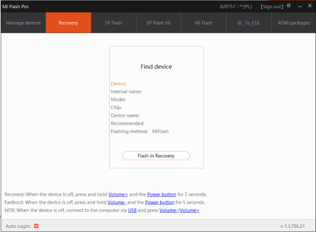 3. Po kliknięciu zakładki Recovery jest "Select device" ale nie ma telefonu Redmi 9C, a po prawej stronie pisze "Couldn't find device" więc w telefonie wybrałem "Connect with MiAssistant" w programie pojawiło się okno Find device z wierszami Device, Internal name, Model Chip, Device name ale wszystko puste. Jedynie w Flashing method jest: MiFlash, a poniżej przycisk Flash in Recovery.