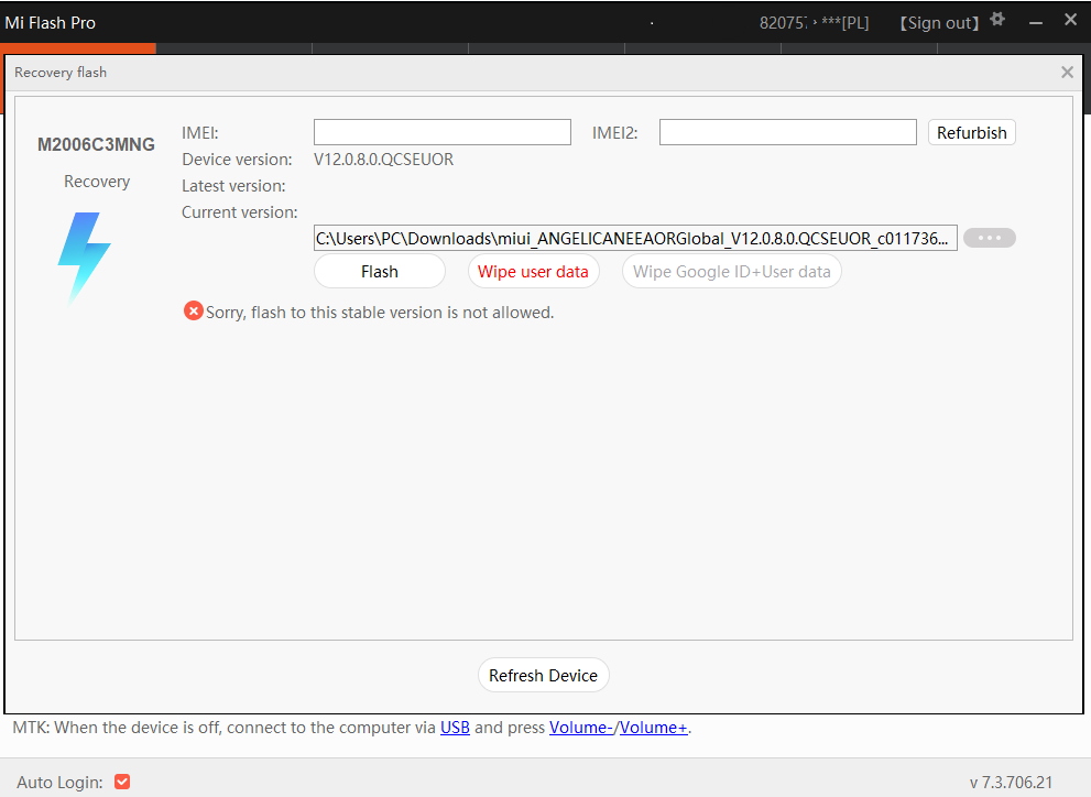 Kliknąłem "Flash in Recovery" i pokazała się wersja V12.0.8.0.QCSEUOR, a na necie znalazłem tylko V12.0.8.0.QCSEUXM: