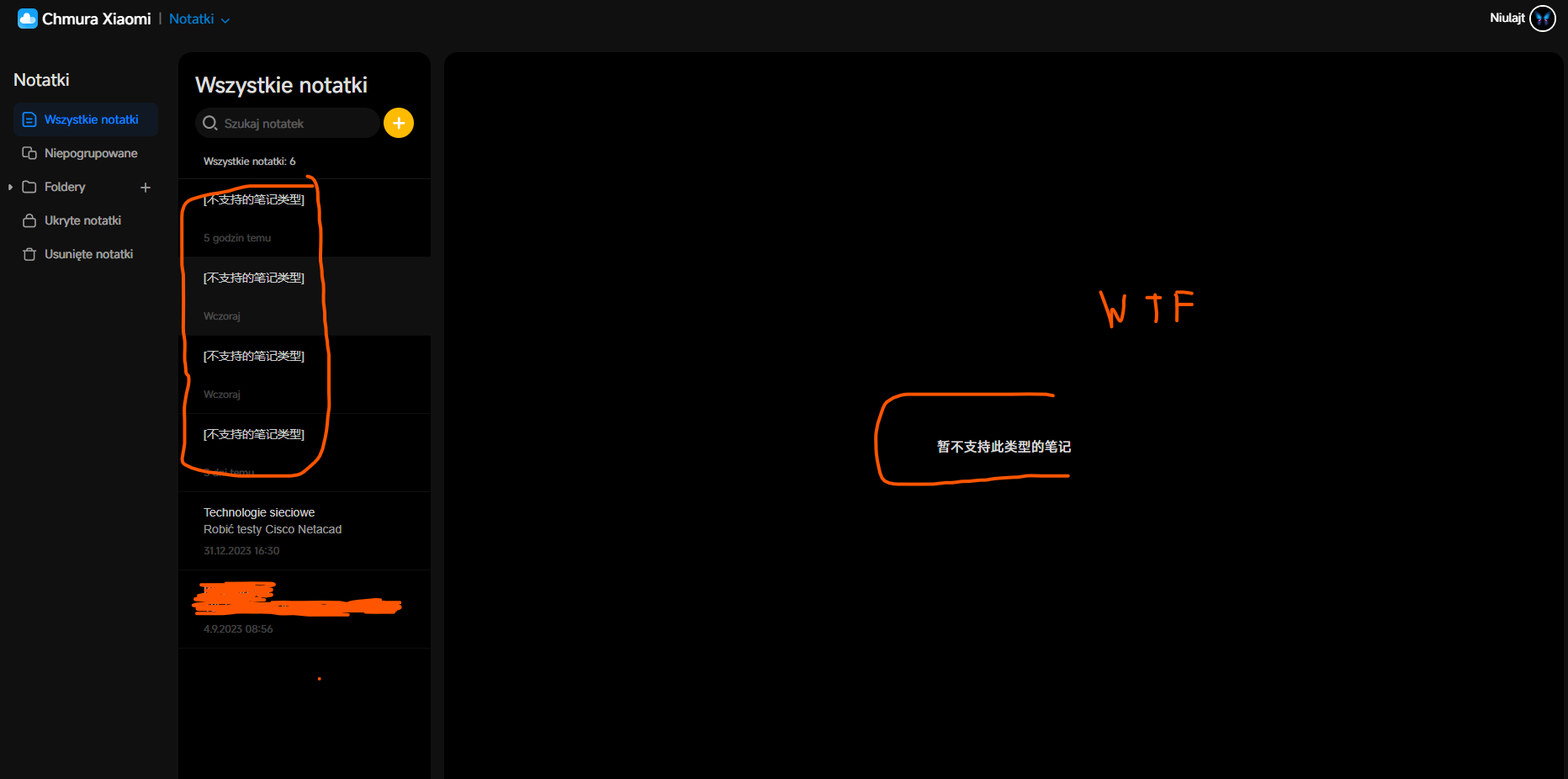 posiadam tablet Xiaomi Pad 6, używam go między innymi do robienia odręcznych notatek rysikiem. Mam włączoną synchronizację z chmurą Xiaomi i teoretycznie powinienem być w stanie otwierać notatki na komputerze stacjonarnym logując się do chmury w przeglądarce. Niestety zamiast odręcznych notatek (zwykłe wyświetlają się poprawnie) wyświetla się komunikat w języku chińskim. Informuje mnie on o braku obsługi notatek. Załączam screen.