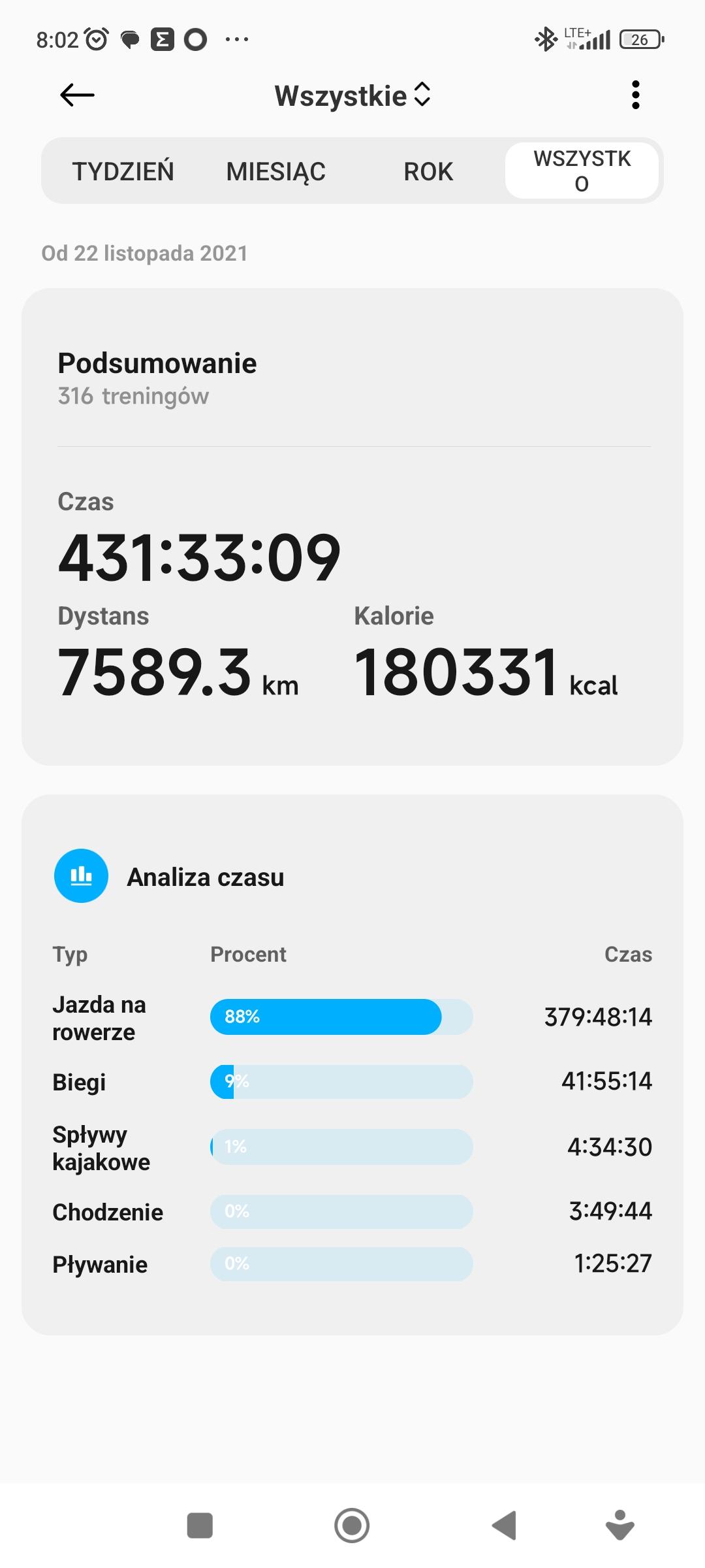1. Witam od dnia wczorajszego po wejściu w aplikacji Mi Fitness nie ma historii treningów. Nie wiem co się stało bo cały czas korzystania z zegarka Watch 3 wszystko było ok mogłem sprawdzić statystyki z np biegania czy jazdy na rowerze z miesiąca czy tez całego roku. Miał ktoś podobny problem i zna rozwiązanie? Na zegarku mam pełną historie treningów a w aplikacji pokazuje mi tylko podsumowanie wszystkich treningów ogółem.