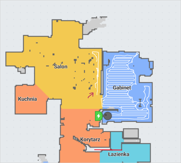 Odkurzacz odkurzając wąskie części w pomieszczeniu, zawiesza się nagle, nie kończy całkowicie odkurzania i wraca do stacji - wysyłając mi powiadomienie że skończył. Na mapie widać, w którym miejscu się zawiesił bo jest tam po prostu ucięta trasa i reszta pomieszczenia jest pominięta.