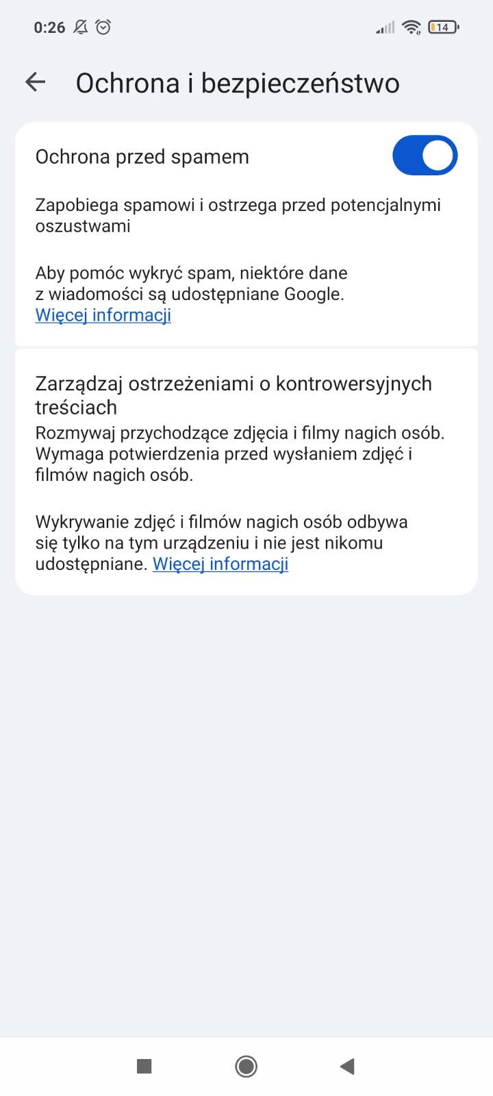 1. Cześć. Po ostatniej aktualizacji Google messages nie mogę zapisywać zdjęć uznanych jako kontrowersyjne. Przykładowe zdjęcie partnerki w stroju kąpielowym i brak opcji zapisania zdjęcia w telefonie. Pojawia się hasło nie można zapisać załącznika. Inne zdjęcia działają. W ochronie spam pojawiła się opcja której nie można odznaczyć. Załączam zrzut ekranu z opcji o treściach kontrowersyjnych. Ogólnie mam profil konta google znacznie ponad wiem pełnoletni i grubo ponad 40+. Może ktoś wie skąd narzucony filtr bez możliwości zmiany?