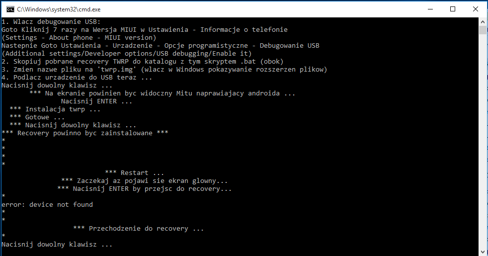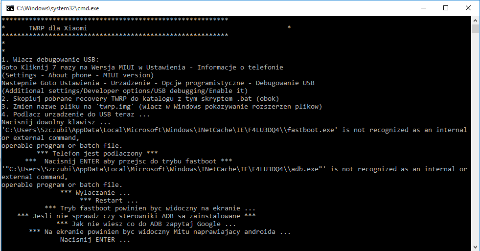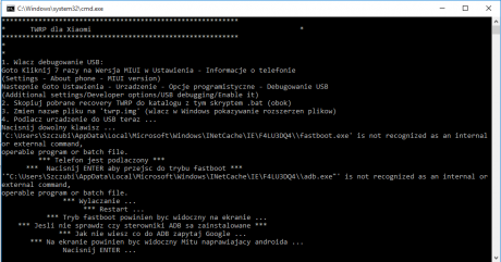 8. Witam, jakiś czas temu odblokowałem bootloader w telefonie. Nie miałem jednak czasu na wgrywanie MIUI Polska, więc dopiero teraz się za to zabieram. Aktualnie posiadam wersje MIUI 7 by xiaomi.eu 6.1.14 (rozwojowa). Pobrałem już recovery o nazwie Xiaomi Redmi Note 3 MTK (Hennessy) oraz polski soft xiaomi.eu_multi_HMNote3Pro_6.7.7_v8-5.1.zip. Korzystam z tego poradnika https://miuipolska.pl/instalacja-miui-2016-2/ , jednak mam problemy z zainstalowaniem. Po pierwsze - Gdzie dokładnie ma być rozpakowany folder recovery? Na pamięci telefonu czy na dysku komputera? Po drugie - Gdzie ma wylądować plik twrp.img? W folderze recovery czy tym od polskiego Xiaomi? Po trzecie - Czy plik Flash_TWRP.bat koniecznie trzeba otworzyć przez wiersz poleceń? Po czwarte - Czy nazwa pliku twrp koniecznie musi mieć końcówkę ".img"? Nie wystarczy że jest po prostu w takim formacie? No i po piąte - Czy na tej wersji MIUI jestem w stanie zainstalować MIUIpolska przez recovery czy jednak trzeba wgrać chiński dev? Jak na razie wyskakuje mi tylko komunikat o tym że telefon powinien się sam zrestartować itp. jednak nic się takiego nie dzieje.
