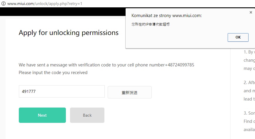 Hej, dzięki pomocy jednego z użytkowników forum udało mi się zainstalować MIUI 9. Teraz mam kolejny problem, a mianowicie brak możliwości zdjęcia bootloadera. Przynajmniej tak to wygląda na pierwszy rzut oka. Problem stanowi potwierdzenie kodu weryfikacyjnego, który przychodzi smsem. Po naciśnięciu next, nie dzieję się nic po za wyskoczeniem okna w przeglądarce (załącznik trzeci) z chińskimi znaczkami. Google translator mówi, że jest to coś w stylu: Liczba żądań IP, które zostały przekroczone. Stwierdziłem, że skoro nie mogę nic zdziałać nastronie, może uda mi się coś przez aplikację Mi Flash Unlock, jednak tam po zalogowaniu widnieje napis o braku wsparcia dla urządzenia (załącznik drugii). Sprawdziłem swoje konto na https://account.xiaomi.com i wszystko wydaje się w porządku, Security mam na 100%, a żadnych danych dotyczących modelu, na swoim profilu nie znalazłem. Dla pewności sprawdziłem przy pomocy fastboota czy ten bootloader na pewno jest... więc, jest (załącznik pierwszy). Z góry dziękuję za pomoc. W przypadku ponownego przeniesienia tematu do kosza, bardzo proszę chociaż o link do tematu, który mi pomoże. Przeszukałem forum i sam nic nie znalazłem.