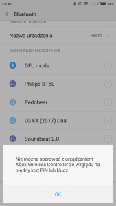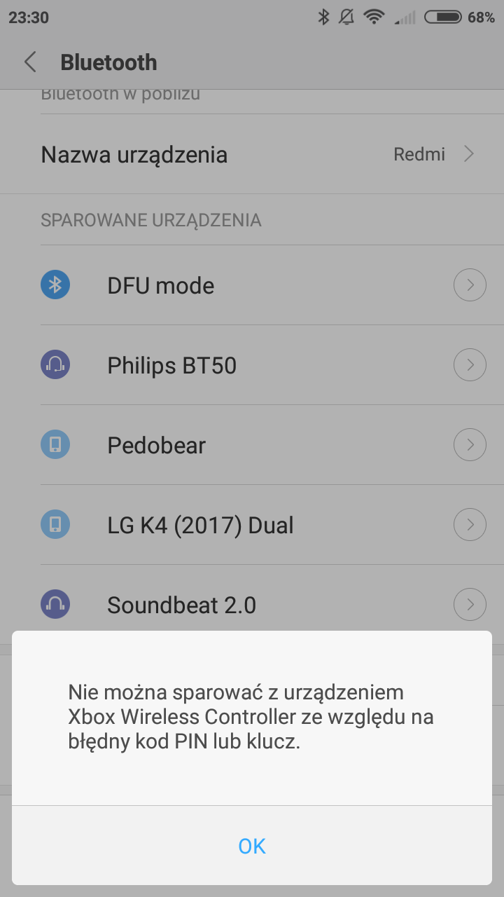 Witam.To mój 3 post na ten temat dlatego że dobra administracja kasuje mi tematy. Wracając do tematu Podczas łączenia pada od xbox one s mam problem. Na ppoczątek Bluetooth dobrze paruje ale po chwili wyskakuje "Urządzenie xbox Wirless Controler nie może być połączony ze względu na błędny klucz lub pin" Żaden klucz, żaden pin nie wyskakuje. Proszę o pomoc Proszę administrację abyście mi nie kasowanie posta za byle co Telefon Xiaiomi redmi 4A Zdjęcia błędu są pod spodem