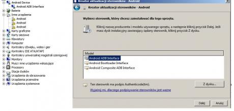 Proszę o pomoc z rozwiązaniem problemu z podłączeniem Xiaomi Redmi 4A do komputera Wersja: MIUI Global 8.0.3.0.0 (MCCCNDI) Debugownie USB - włączone Konfiguracja USB - MTP (Media Transfer Protocol) Sprawdzone na Win 7 Pro SP 1 oraz Win 8.1 x64 Nie można podłączyć pod komputer, MI PC Suit również nie widzi telefonu. Po podłączeniu w menedżerze widać, że wykrywa tak jakby 4 urządzenia: Rys. Menedżer urządzeń. Postępując wedle instrukcji http://gsmusbdriver.com/xiaomi-redmi-4a aktualizuję sterownik w każdym urządzeniu z osobna, wybierając Android ADB Interface (w kolejnych próbach wybieram również pozostałe opcje): Rys.Instalacja. Instalacje kończą się sukcesem, ale komputer i MI PC Suit telefonu nie widzą. Rys. Zainstalowane. Dodatkowe inne opcje jakie wykonałem to: Instalacja sterowników z xiaomitips (http://xiaomitips.com/download/xiaomi-usb-drivers-for-all-devices/) tak samo z miui.com (http://en.miui.com/thread-5610-1-1.html) - nie pomogło. Adbdriver.com również nic nie pomaga (http://adbdriver.com/downloads/) Korzystając z universal adb driver (https://androidmtk.com/download-universal-adb-driver) w każdej z wersji, program od razu podpowiada że sterownik jest niepoprawny): Rys. universal adb driver 01 Ale tutaj jest trochę dziwna sytuacja bo program tak podpowiada jak nie są zainstalowane sterowniki z http://gsmusbdriver.com/xiaomi-redmi-4a. Jeśli odpalimy program tuż po instalacji tych sterowników to widzimy że wszystko jest w porządku i że sterownik jest poprawny i już zainstalowany: Rys. universal adb driver 02 Fakt faktem, przy żadnej z tych prób komputer nie widzi telefonu zarówno pod Win 7 jak i Win 8. Każda pomoc, rada mile widziana, z góry dziękuję za jakiekolwiek podpowiedzi.