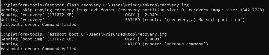 Jak zainstalować w tym fonie TWRP ?? Stosuje najnowsze TWRP: twrp-3.7.0_12-1-sunstone-TeamWin.img I zawsze wywala coś takiego (proszę się nie sugerować ścieżkami dostępu, są ok) Te ścieżki zastosowałem jak gość na YouTube, jak robię w katalogu: platform-tools, jest dokładnie to samo. Tutaj jest zmienione TWRP na recovery. img, ale czy daje pełną nazwę, czy zmienię w katalogu na twrp.img jest dokładnie to samo. Udostępnię Team Viewer do zdalnej pomocy, byleby ktoś pomógł . Może znajdzie się ktoś, kto to zrobił i mu się udało. Bardzo proszę. Poniżej screen co wyskakuje: -