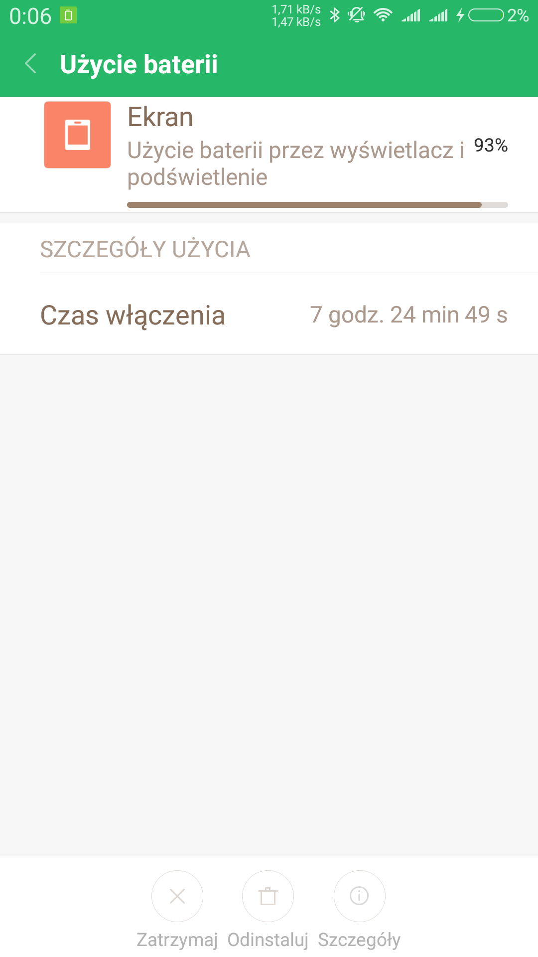@GUTEK@ Opublikowano 2 Kwietnia 2017 Opublikowano 2 Kwietnia 2017 Mój, chciałem dziada szybko rozładować po tym 3 godzinnym ładowaniu i zobaczyć czy po czyszczeniu cache coś się zmieniło. Soft 7.3.30, dualsim 2x3G (Plus i Aero2), Wifi i BT - zresztą tak jak masz na screenie w pasku. Początkowo różne rzeczy, internet, apki, przez chwilę się bawiłem vr, tak gdzieś do około 60%, potem włączyłem telewizje w apce VideoStar i tak go zostawiłem, jasność ustawiona na maxa. Czas działania poniżej:
