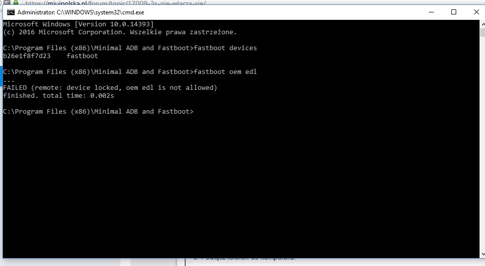 binczu Opublikowano 3 Czerwca 2017 Opublikowano 3 Czerwca 2017 Dnia 1.10.2016 o 18:13, damiaantt napisał: Dzięki koledze @dkiejko rozwiązałem swój problem żeby było dla potomnych, szybką instrukcję aktualizacji telefonu przez PC - pomaga na problemy z zawieszaniem się telefonu na logo "Mi", jak i pewnie wiele innych (w tym przypadku jest to aktualizacja do wersji 8.0.3 - ale pewnie działać będzie w przypadku nowszych): 1. Ściągnij ROM http://en.miui.com/a-234.html -> szukaj Redmi 3S/Prime Latest Global Stable Version Fastboot File Download (lub inny w zależności od telefonu) 2. Ściągnij ADB https://www.androidfilehost.com/?fid=24521665358595410 3. Ściągnij MiFlash https://www.androidfilehost.com/?fid=24591000424945514 4. Rozpakuj ROM na dysku 5. Uruchom Xiaomi w trybie fastboot - vol - i power ma się świecić logo fastboot. 6. Podłącz telefon do komputera. 7. Włącz ADB jako administrator i wklej to: fastboot devices fastboot oem edl i kliknij enter. 8. Uruchom MiFlash jako administrator i znajdz wypakowaną paczkę ROMu - wystarczy zaznaczyć folder w którym ROM się znajduje 9. W MiFlashu na samym dole zaznacz flash all. 10. Kliknij FLASH i czekaj do zakończenia instalacji (ok. 5min) 11. Odłącz telefon od komputera i trzymaj power jakieś 10 sekund. - przy pierwszym uruchomieniu trwa to długo - ok. 2-3min - cierpliwości. Mam problem, proszę o pomoc. Po wklejeniu komend do adb wyskakuje brak dostepu, a w mi flasz zawsze czegos brakuje, juz sciagalem kilka romow