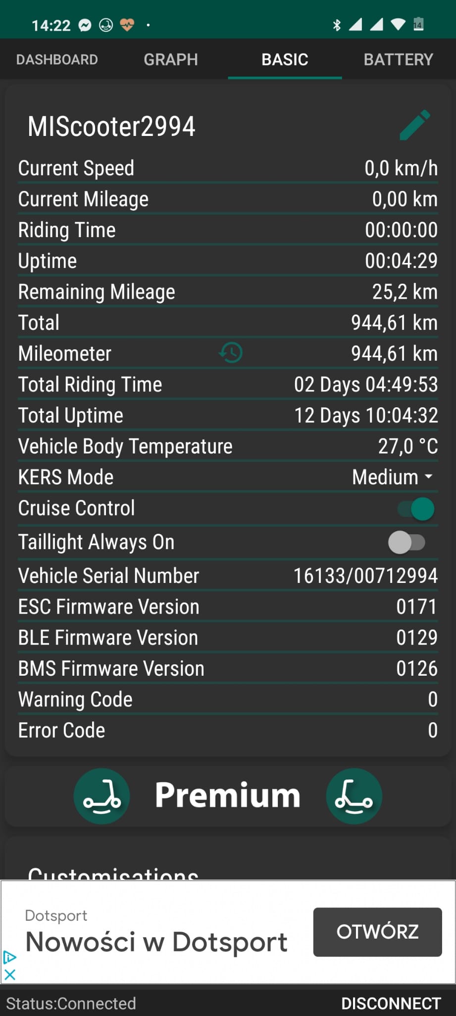 Zaczęło się generalnie jakiś miesiąc temu od tego, że hulajnoga sama się włączała ale byłem w stanie ją wyłączyć przyciskiem, zostawiłem ją do pełnego rozłądowania i po ponownym uruchomieniu nie było z nią żadnych problemów i taki stan utrzymywał się przez miesiąc. Po ostatniej przejażdżce stan pozostał jak na filmiku: jedna z diód miga, co 10-20 min wydaje z siebie pojedyńcze piknięcie i nie jestem w stanie się z nią połączyć przez xiaomi home (wymaga nacisnięcia przycisku, a podczas naciskania nic się nie dzieje). Dodam, że po podłączeniu normalnie się ładuje co widzę po stanie naładowania w aplikacji.